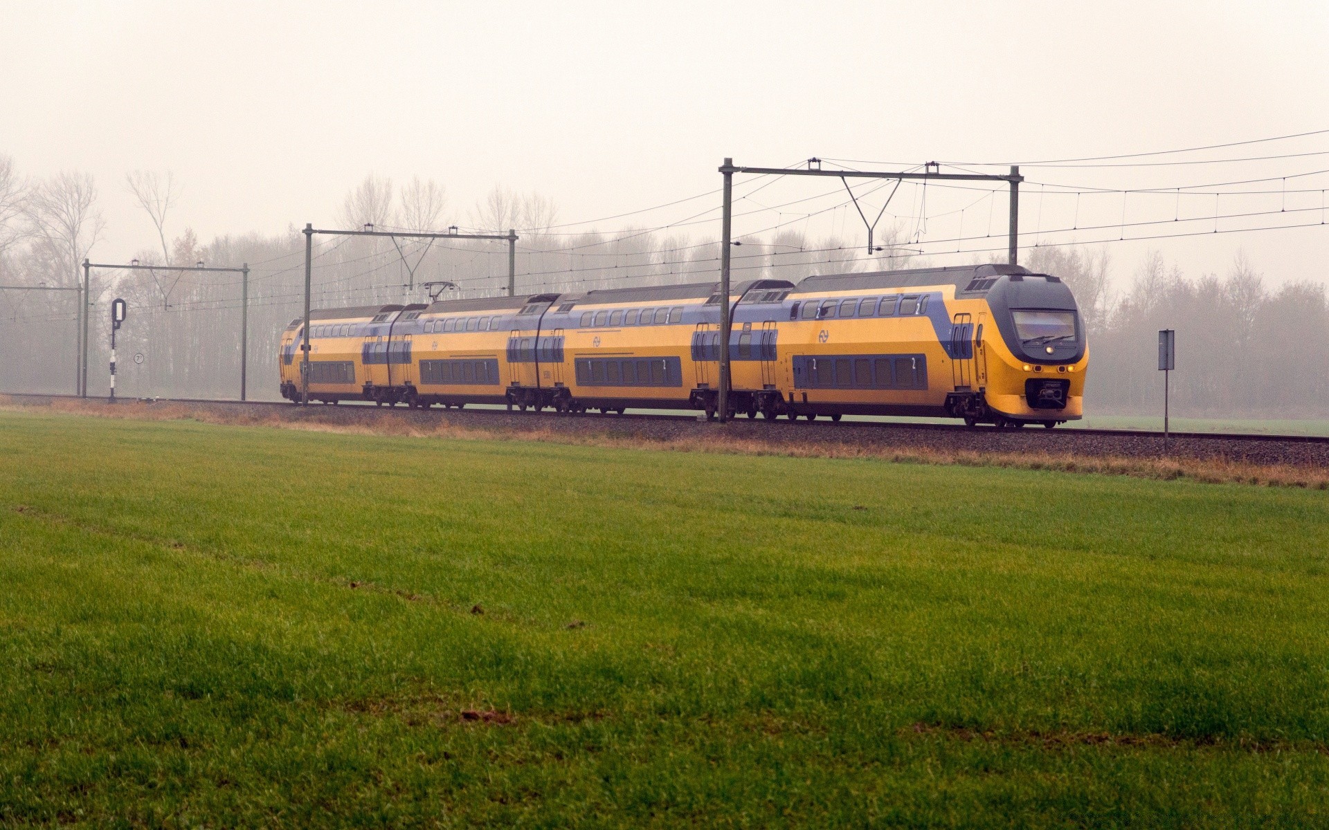 TREM ELÉTRICO NO NEVOEIRO NO FUNDO DO GRAMADO NO NEVOEIRO