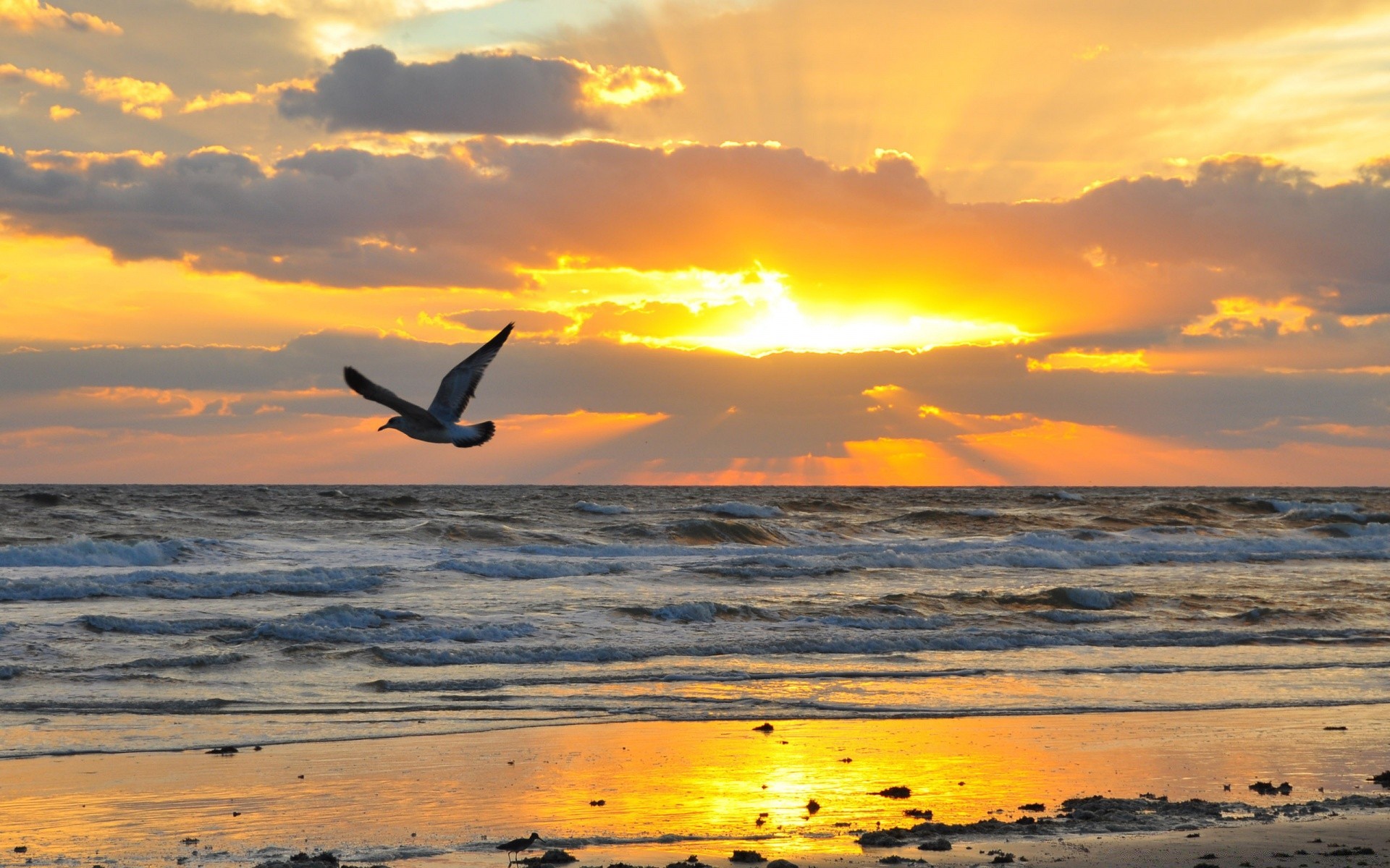 Pássaro voa no fundo das ondas do mar e do pôr do sol