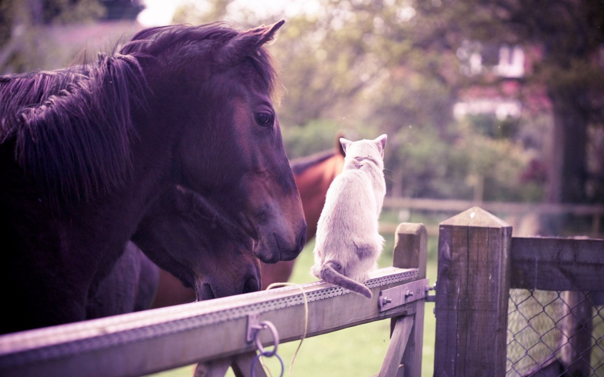 Cavalos conversam com um gato branco
