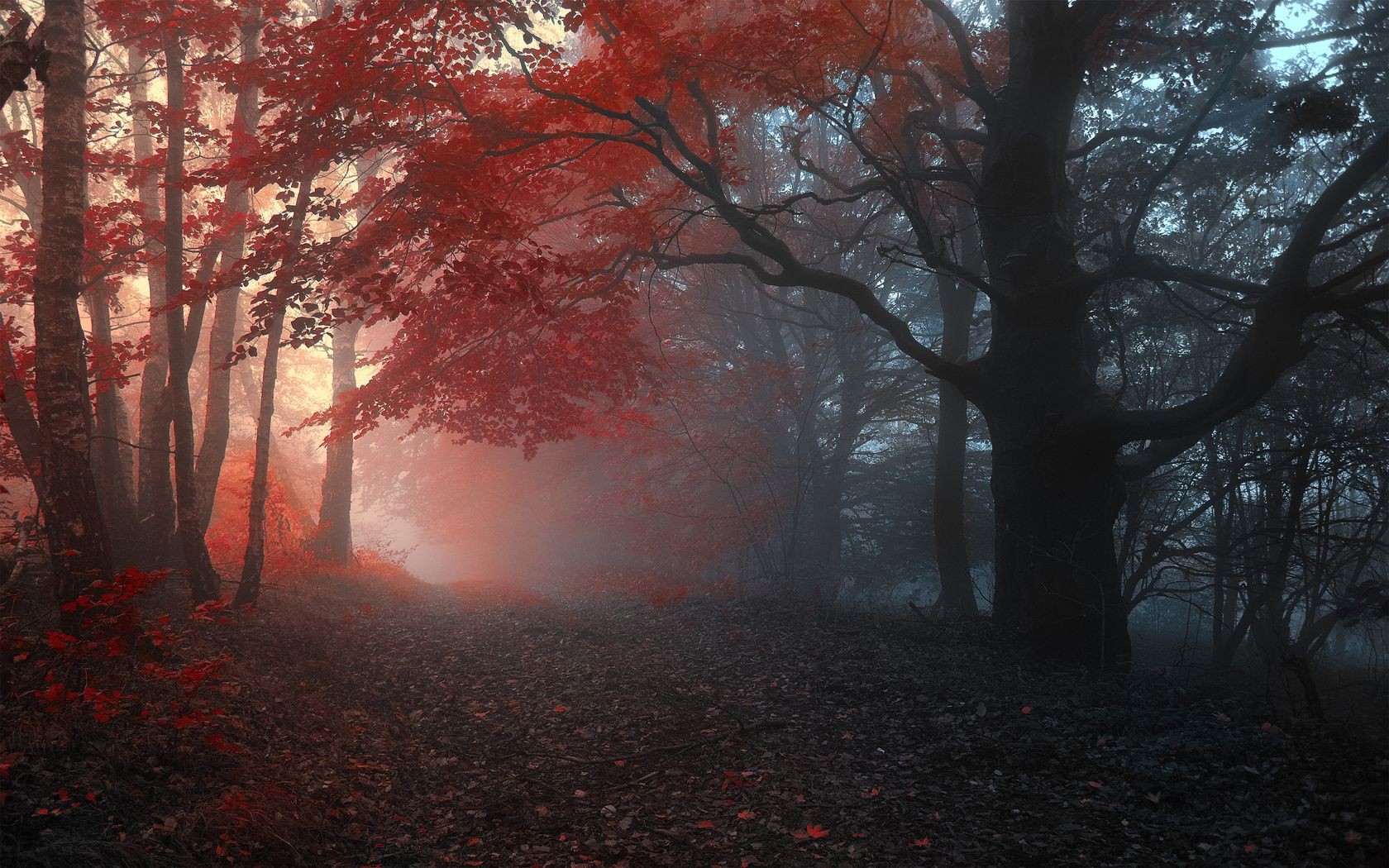 Floresta escura com Photoshop vermelho