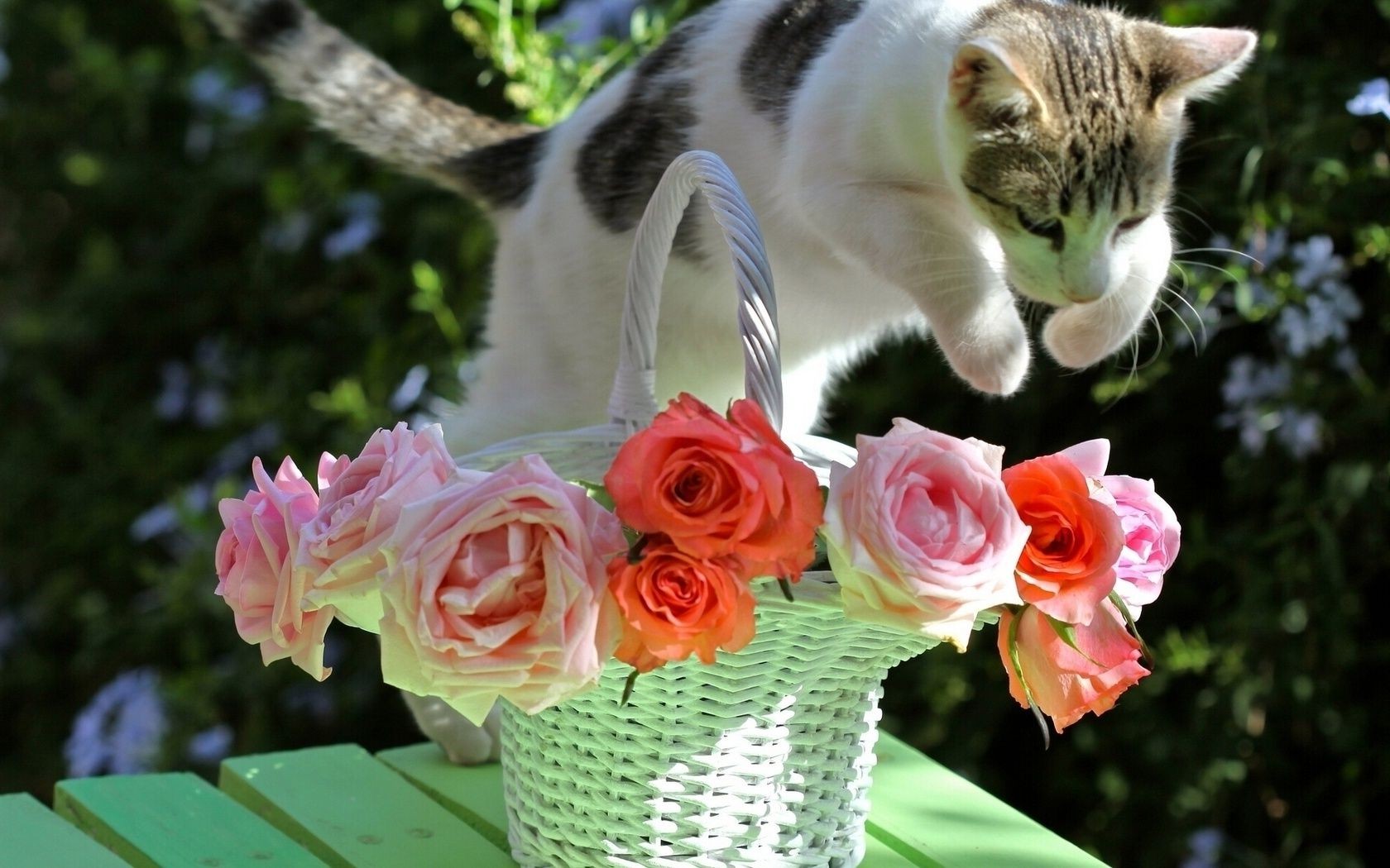 Cesta de rosas e o gato no salto