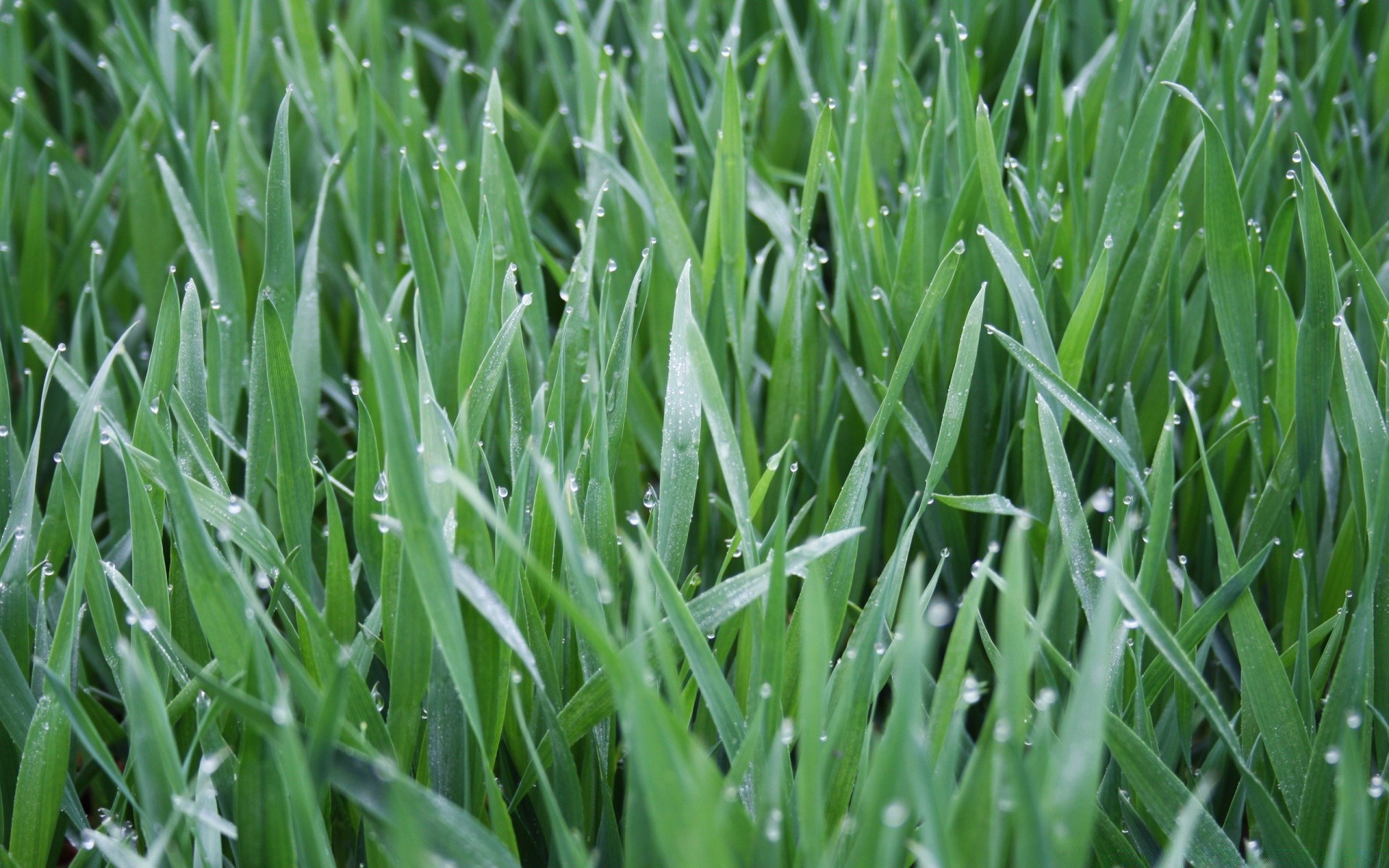 Gotas de água brilhantes na grama em tons de cinza sobre um fundo desfocado
