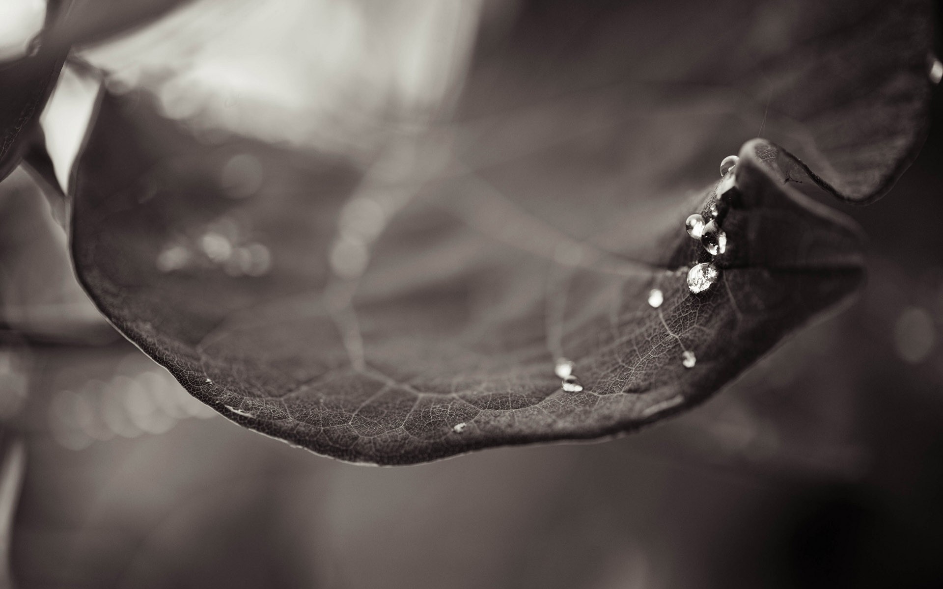 Folha monocromática com gotas de chuva