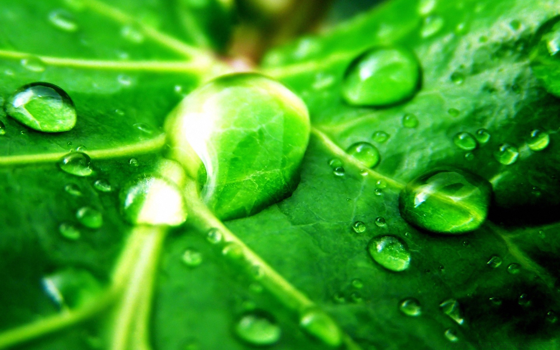 Gotas de chuva em uma folha com veias