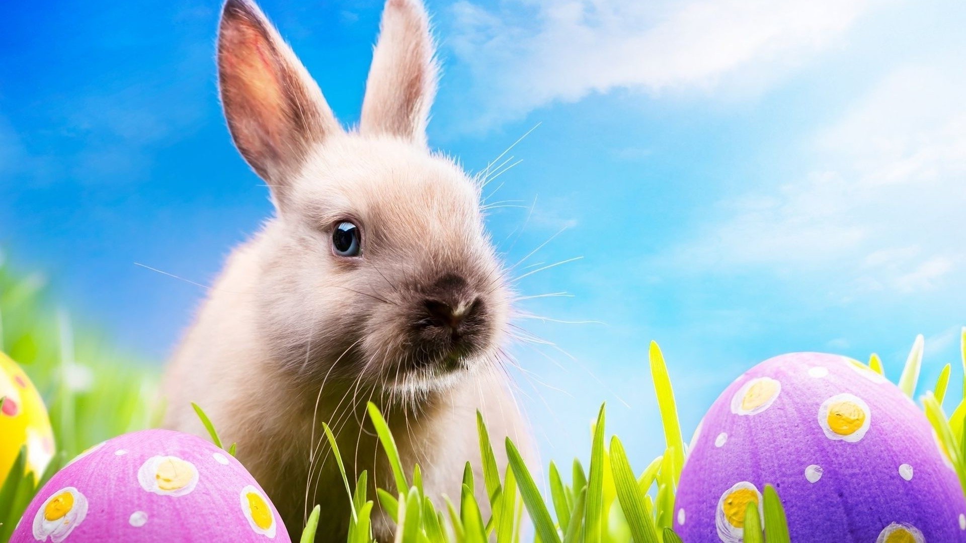 Coelho com ovos de Páscoa na grama no fundo do neban azul