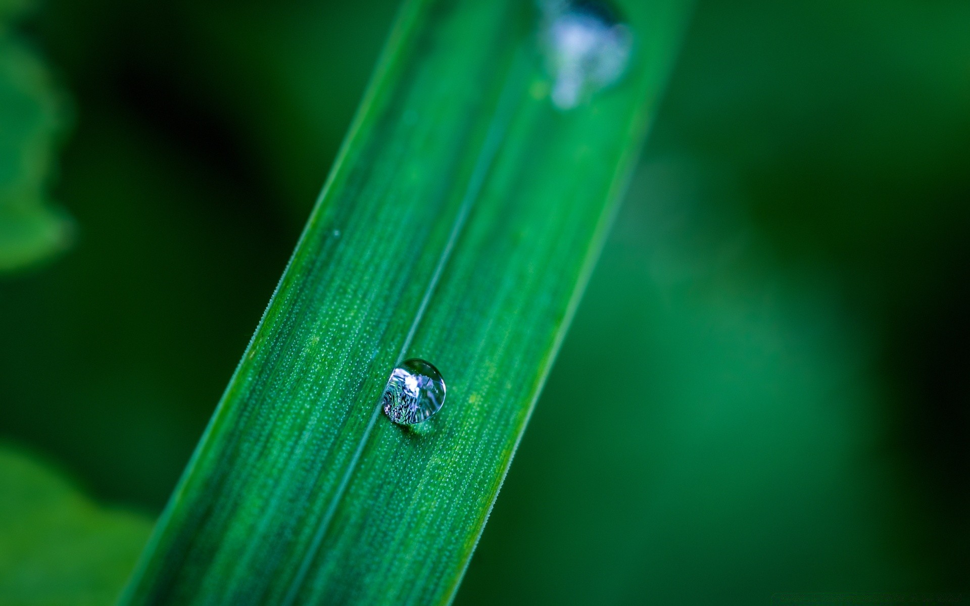 Fotografia Macro de uma folha de grama verde decorada com gotas de orvalho