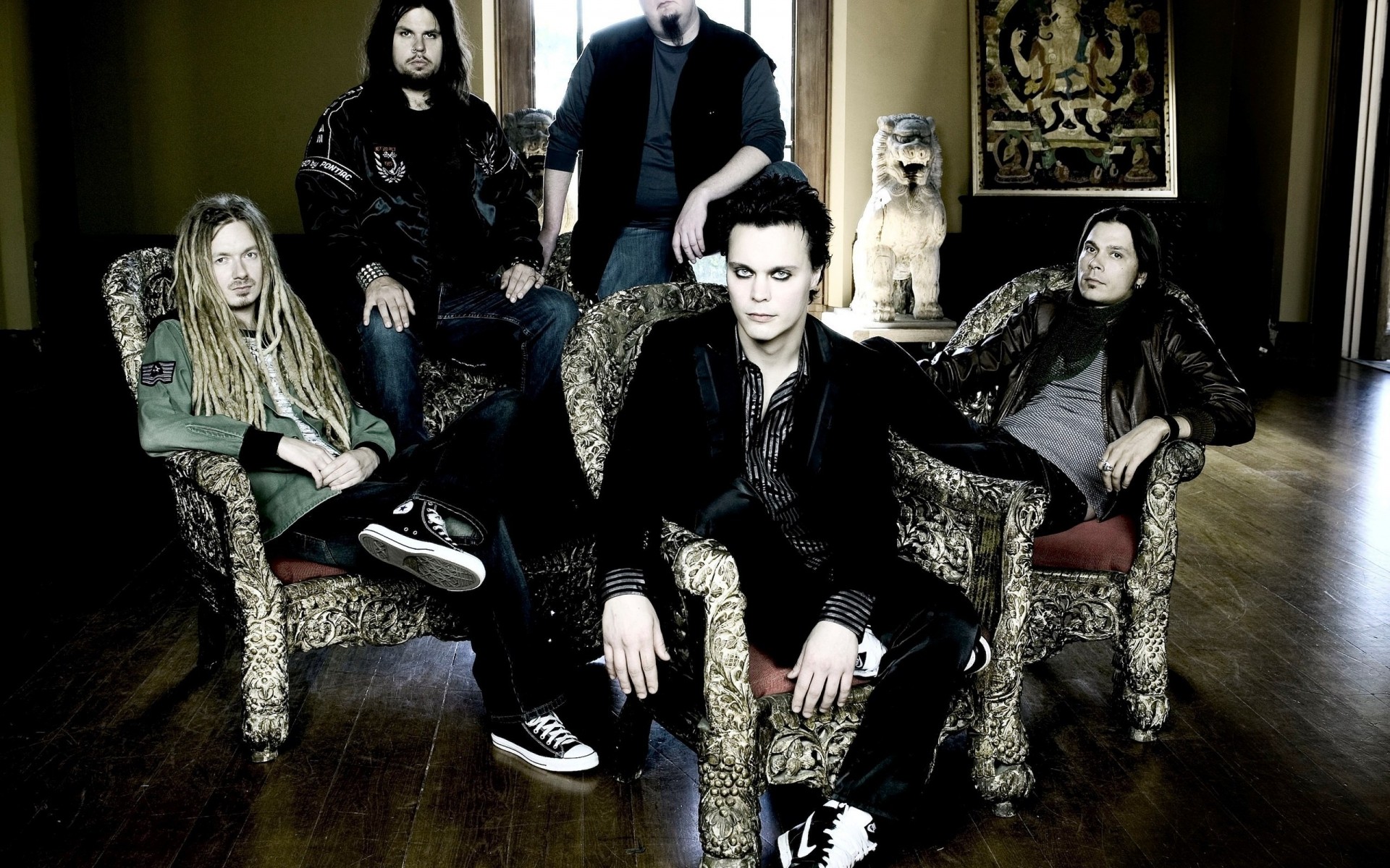 Cinco homens de uma banda musical em uma sala com cruzes e uma estátua de um tigre