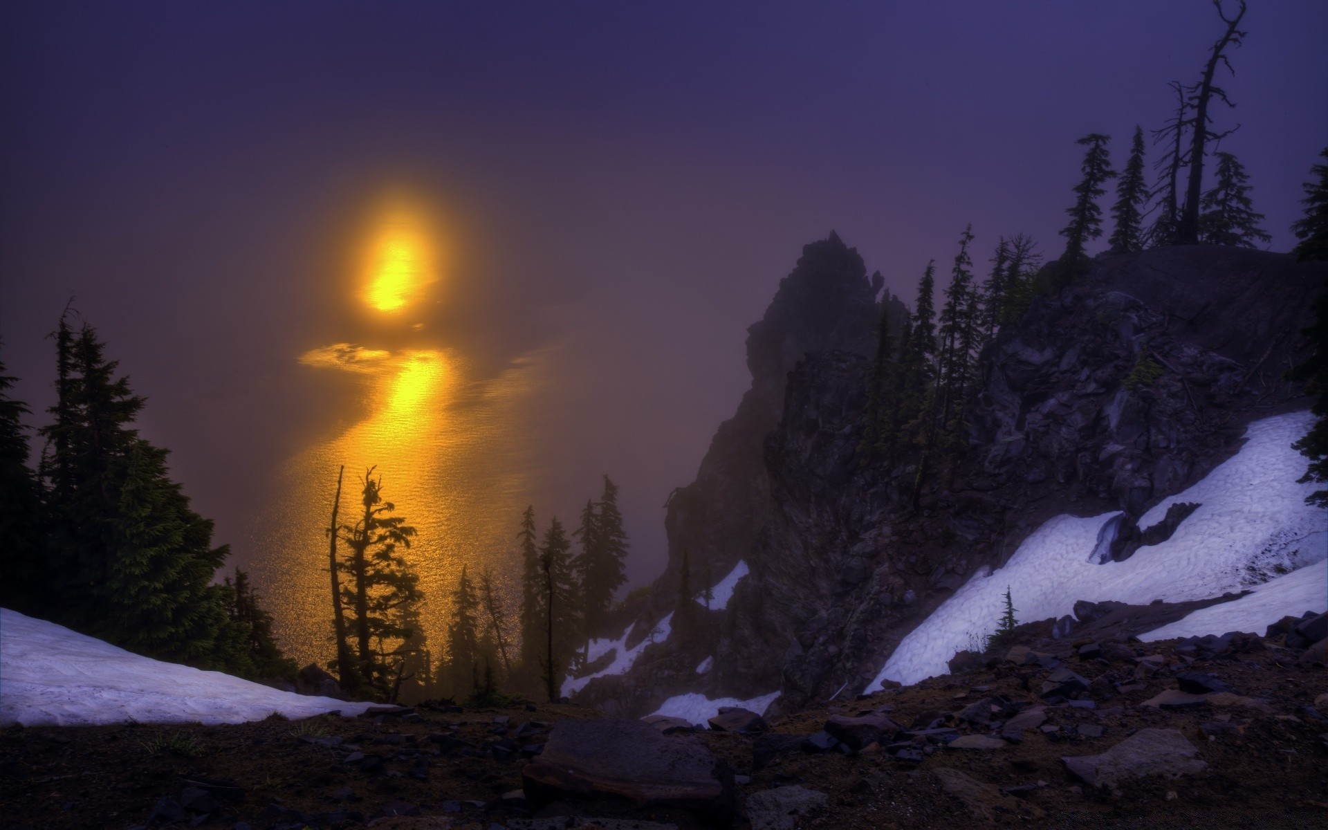 Montanhas e árvores de Natal em uma noite de neve no fundo da lua brilhante