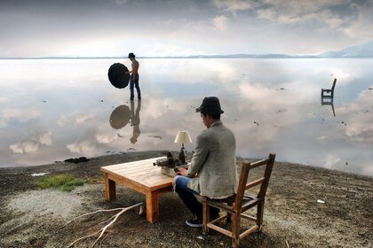 Foto em preto e branco com uma teia de aranha no fundo da cidade