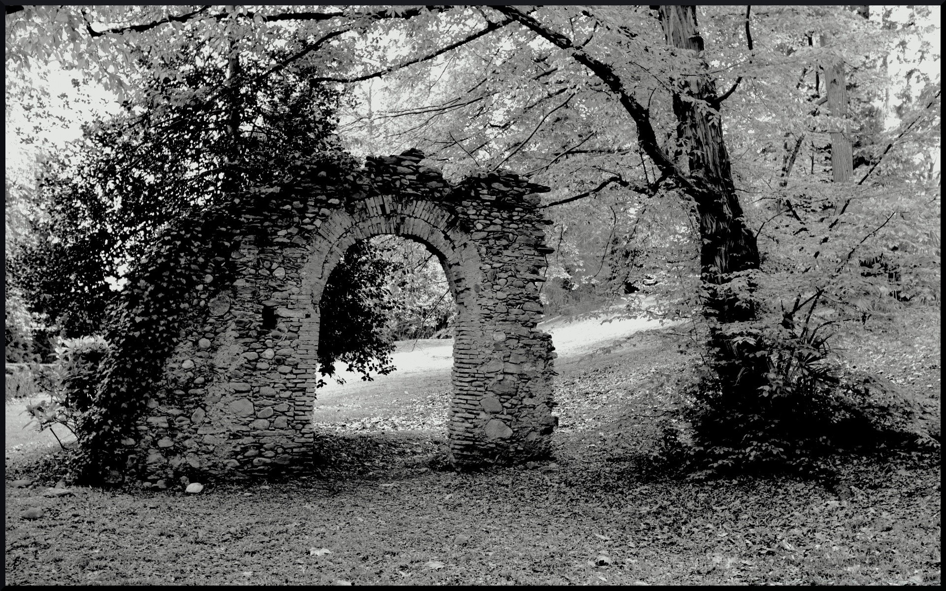Foto de uma estrada coberta de neve e um edifício amarelo atrás das árvores