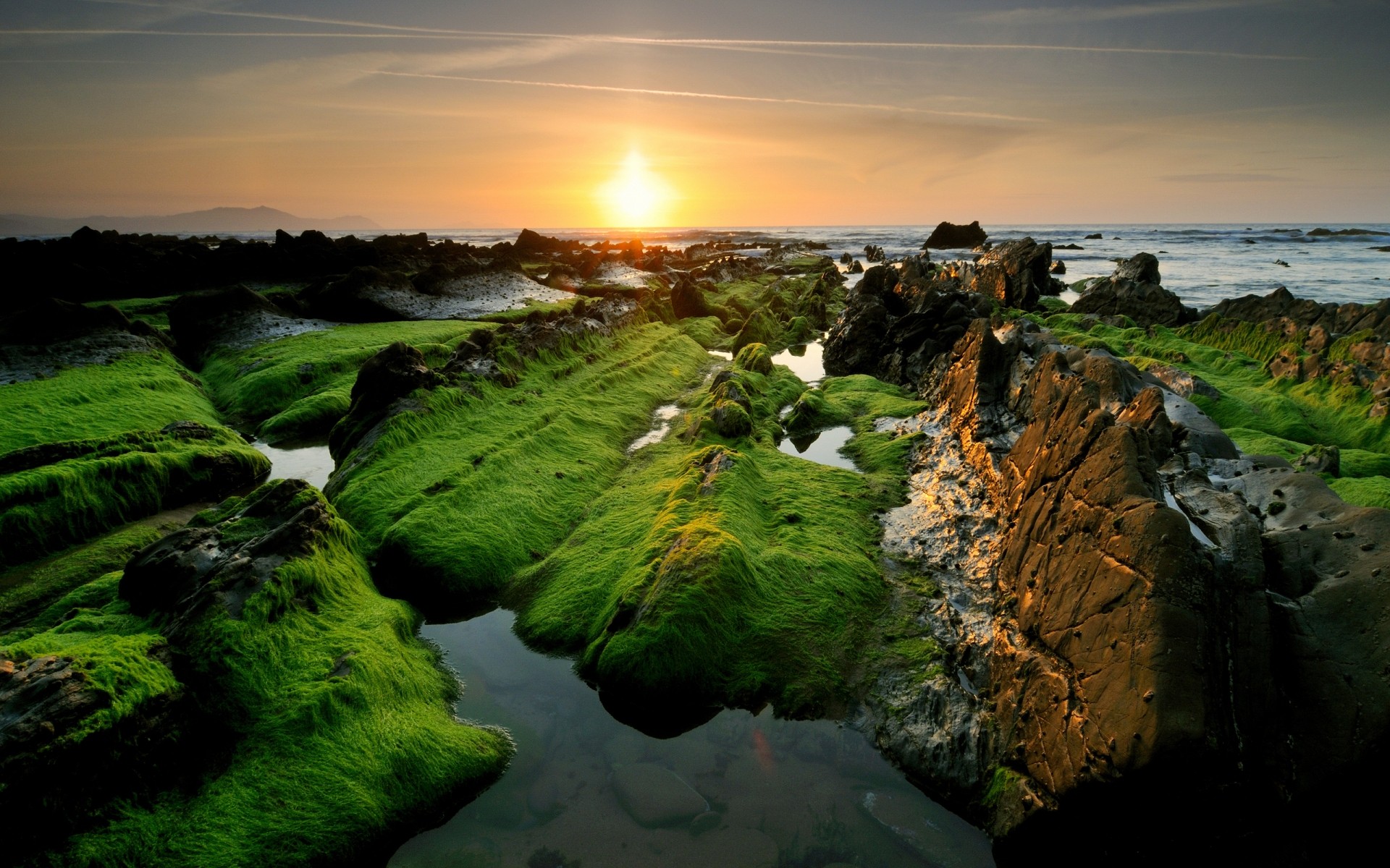 Pedras cobertas de grama em forma de ilhas ao pôr do sol