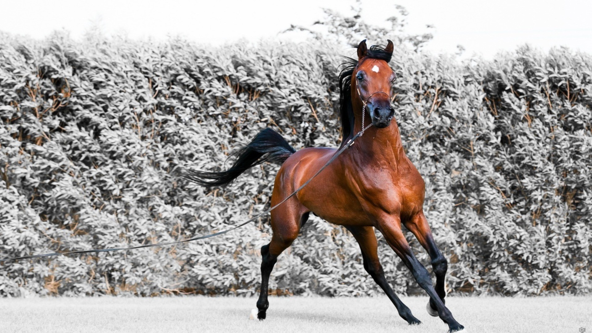 Cavalo vermelho no fundo da floresta de Inverno
