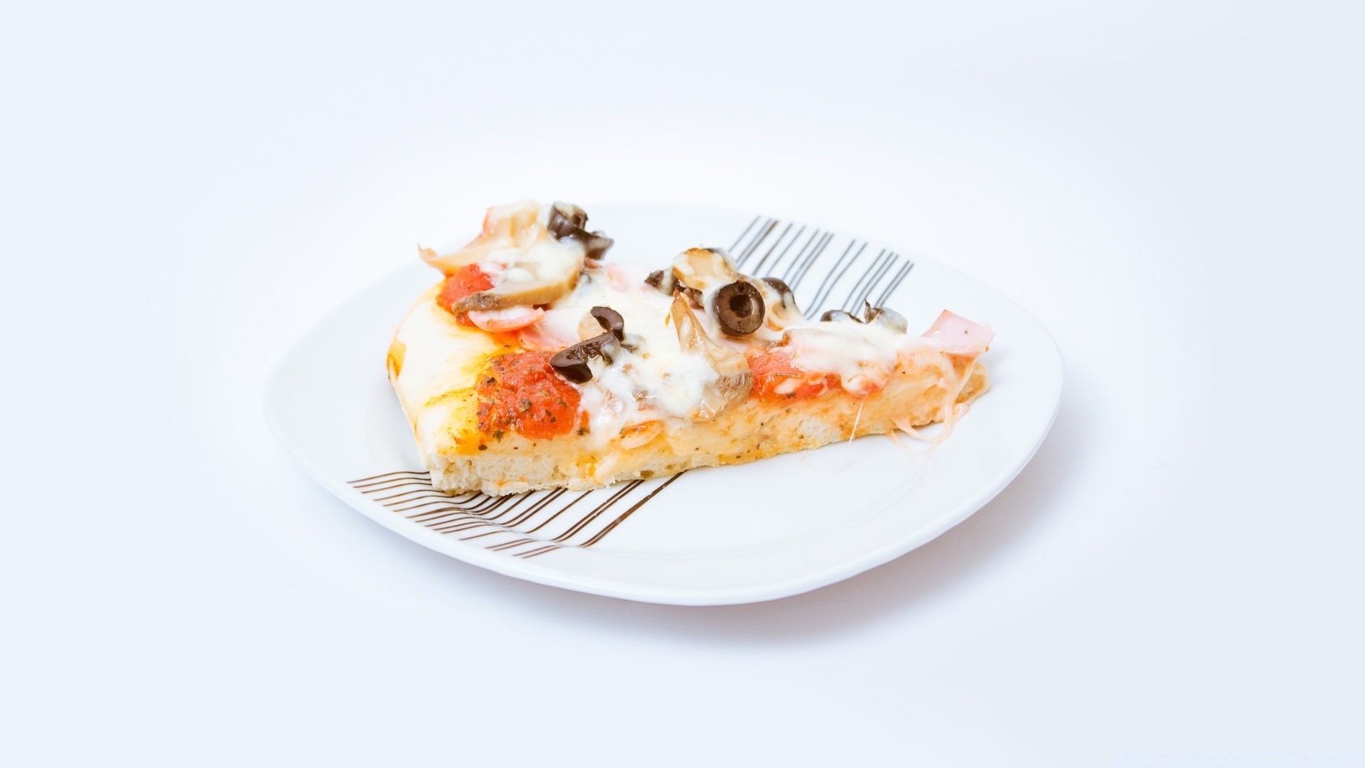 Fatia de pizza com frango e cogumelos em um prato branco listrado preto