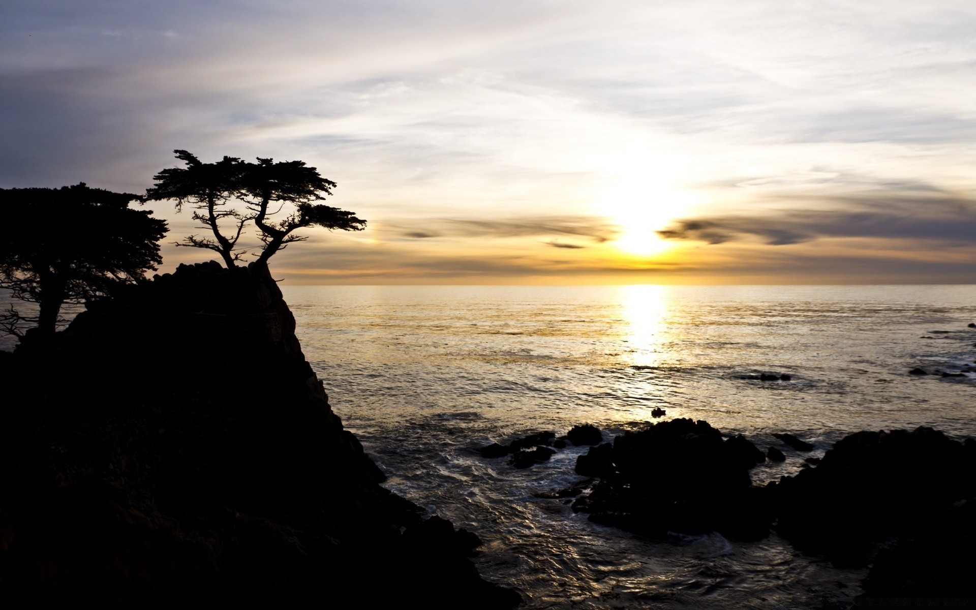 Silhuetas de palmeiras ao pôr do sol nas rochas
