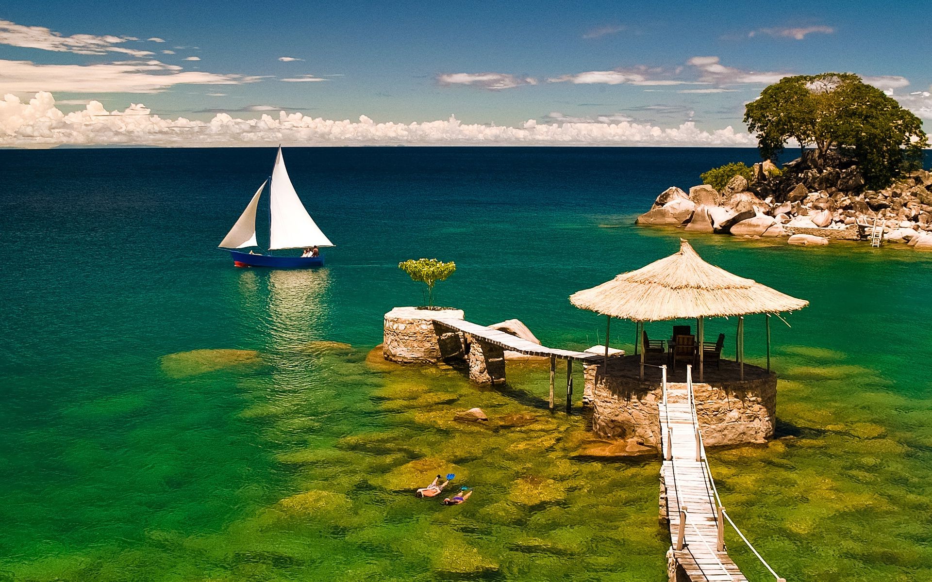 Veleiro árvore e ilhas de pedra entre a água azul-turquesa
