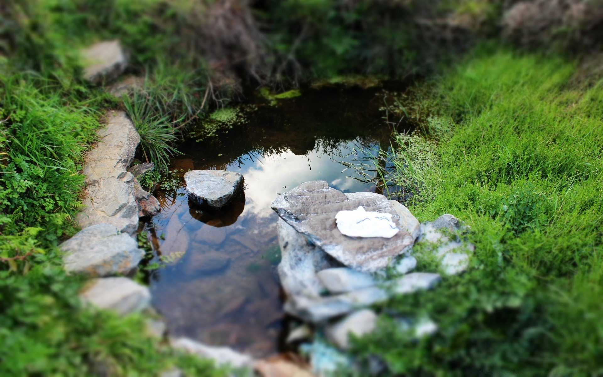Um pequeno lago com pedras no fundo