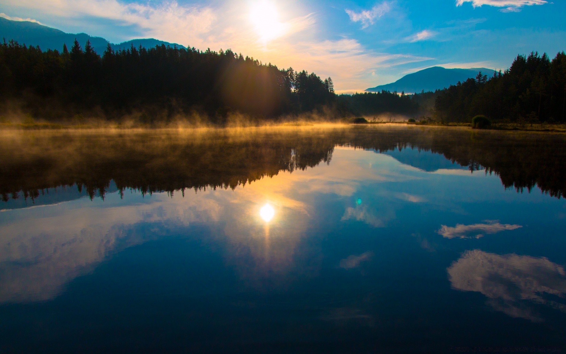 Patos no lago ao pôr do sol pode-se ver o reflexo