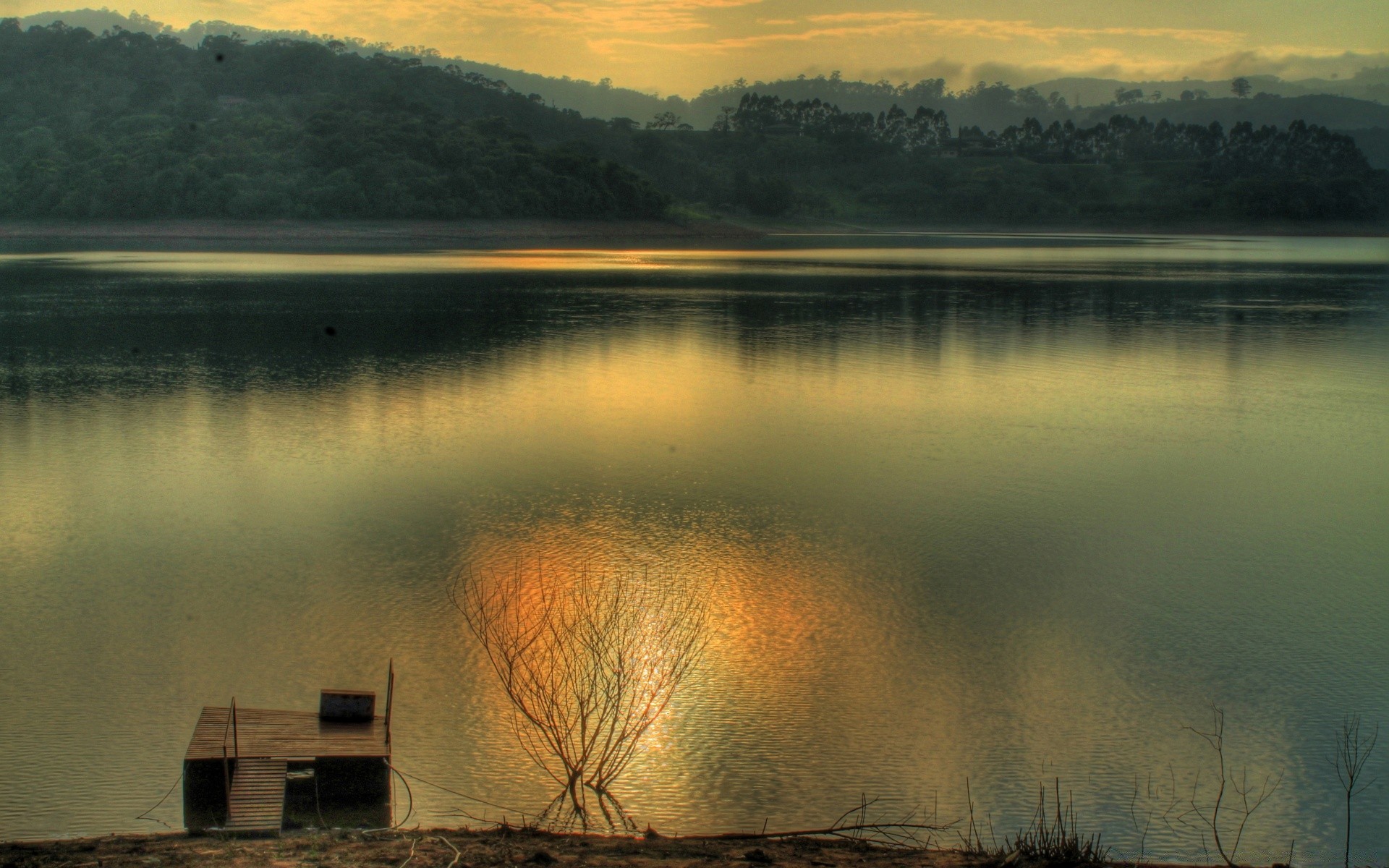 Floresta e Lago na névoa do pôr do sol