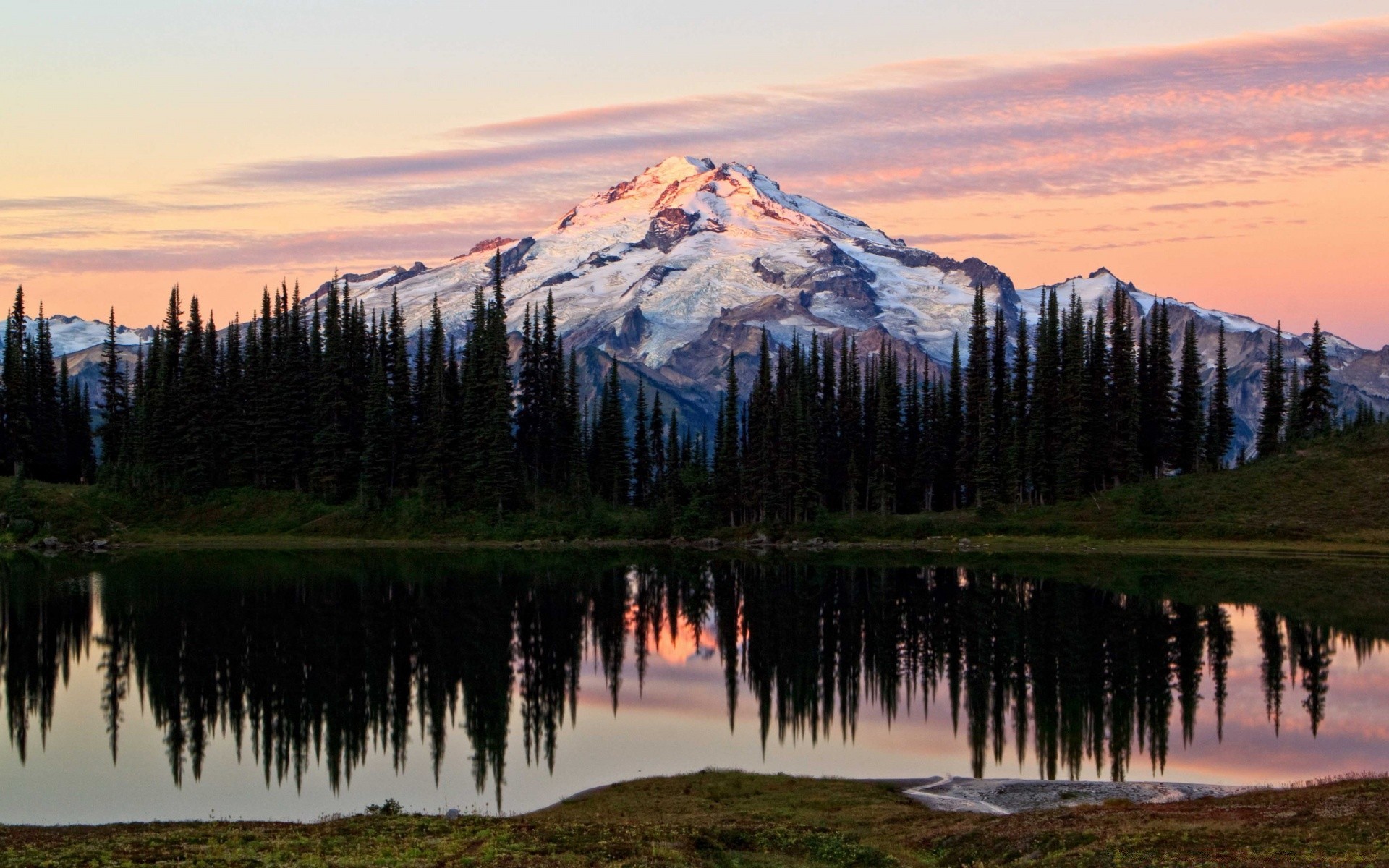 Atrás do lago há uma floresta e atrás da floresta há uma montanha