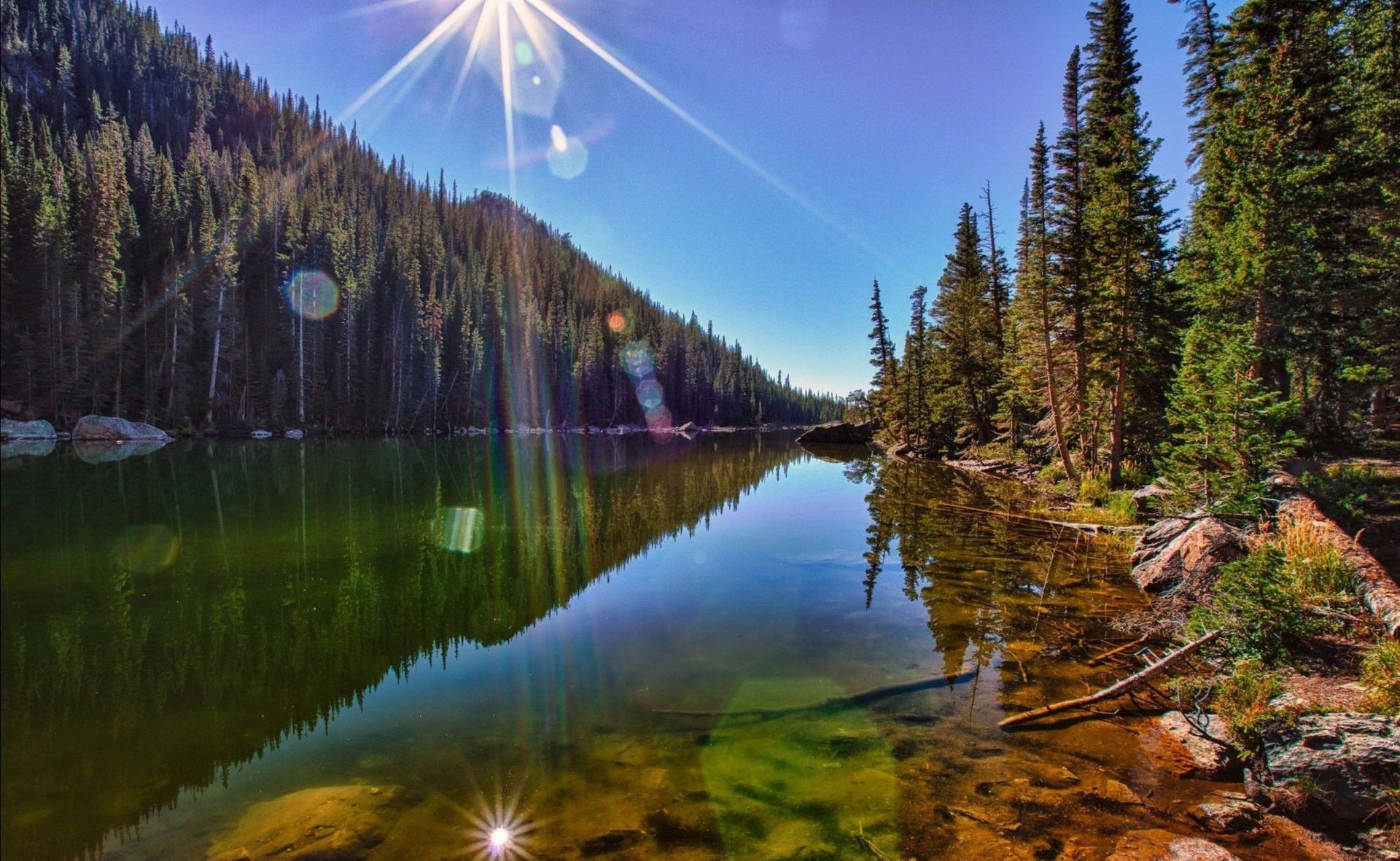 Reflexão do pôr do sol na paisagem do lago da floresta