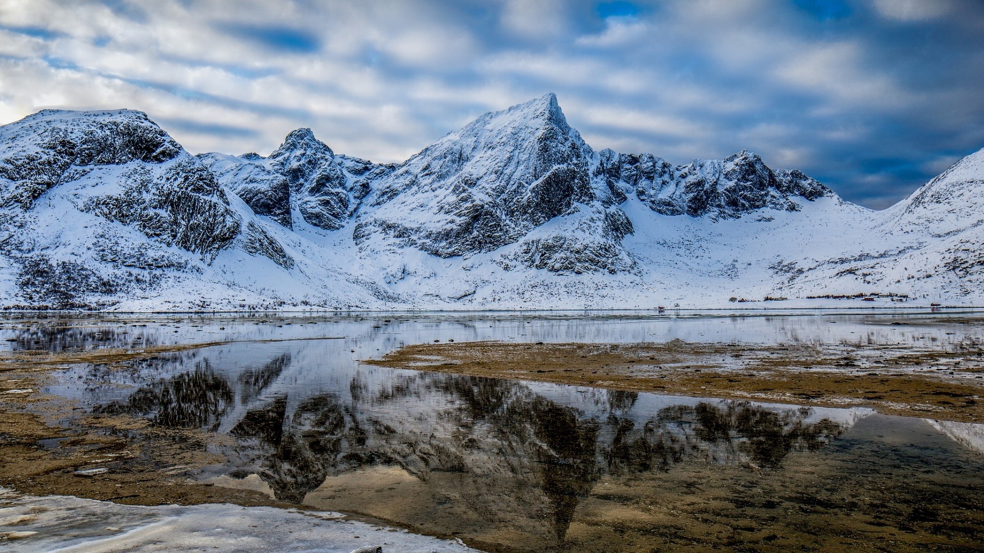 O gelo congela no lago em uma crosta fina sob os raios do pôr do sol esfriando