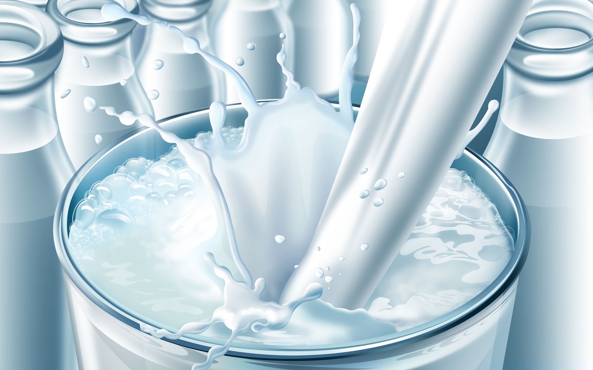 Animação de leite derramando em um copo entre as garrafas cheias de leite