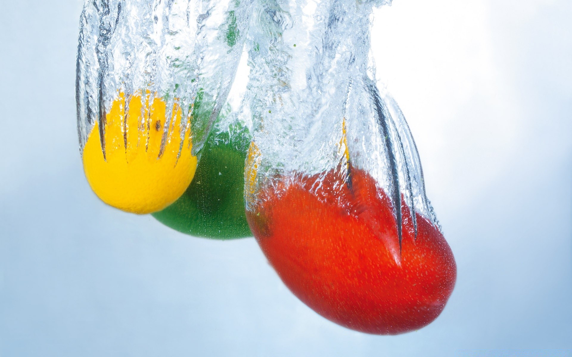 Frutas amarelas, vermelhas e verdes brilhantes caem na água