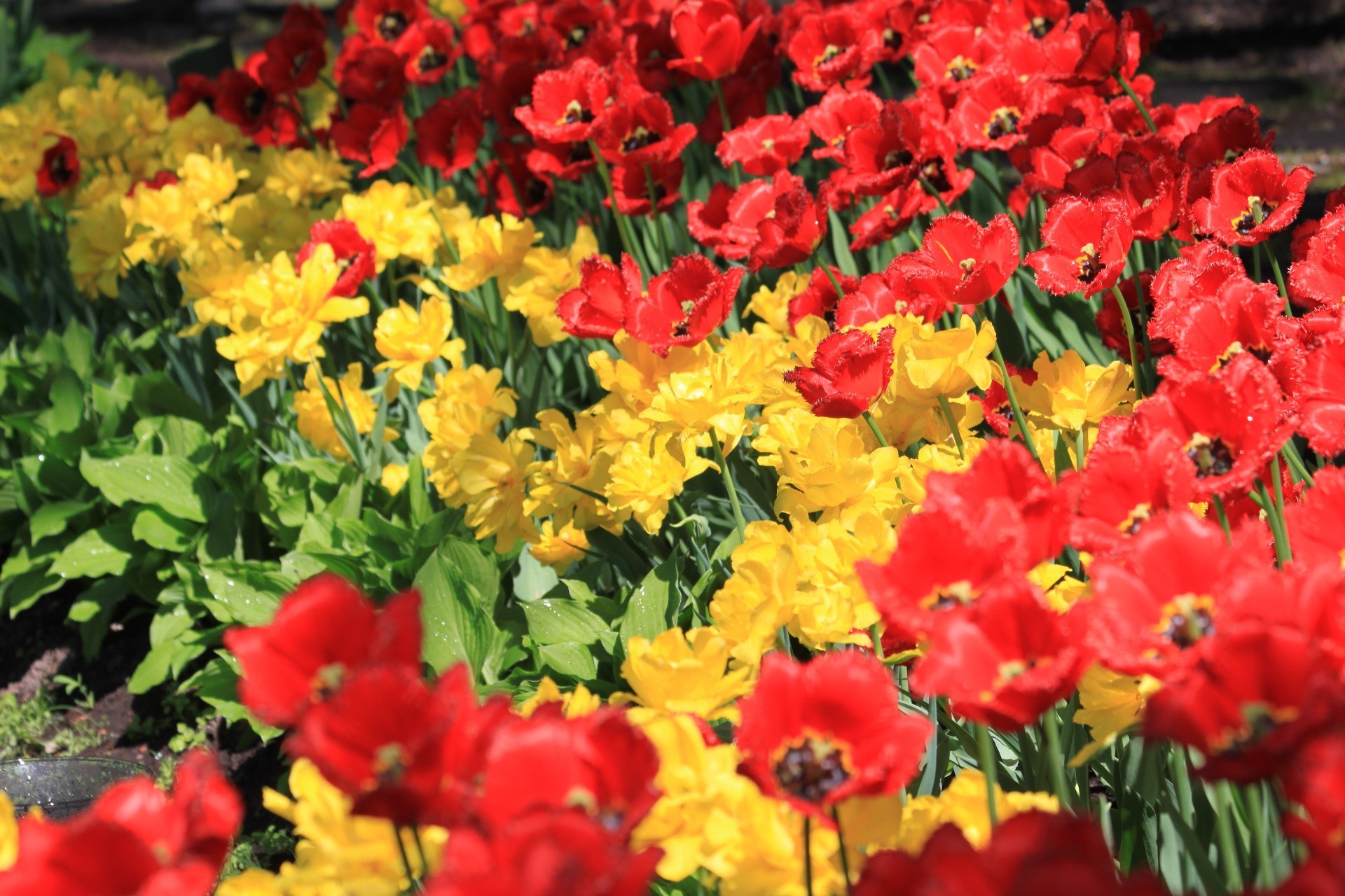 Tulipas vermelhas e amarelas florescem