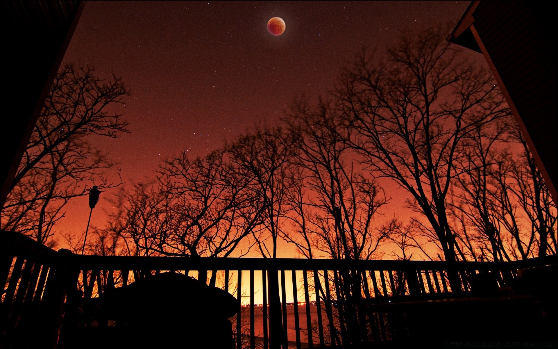 Vista da natureza com Pôr do sol e Lua Vermelha