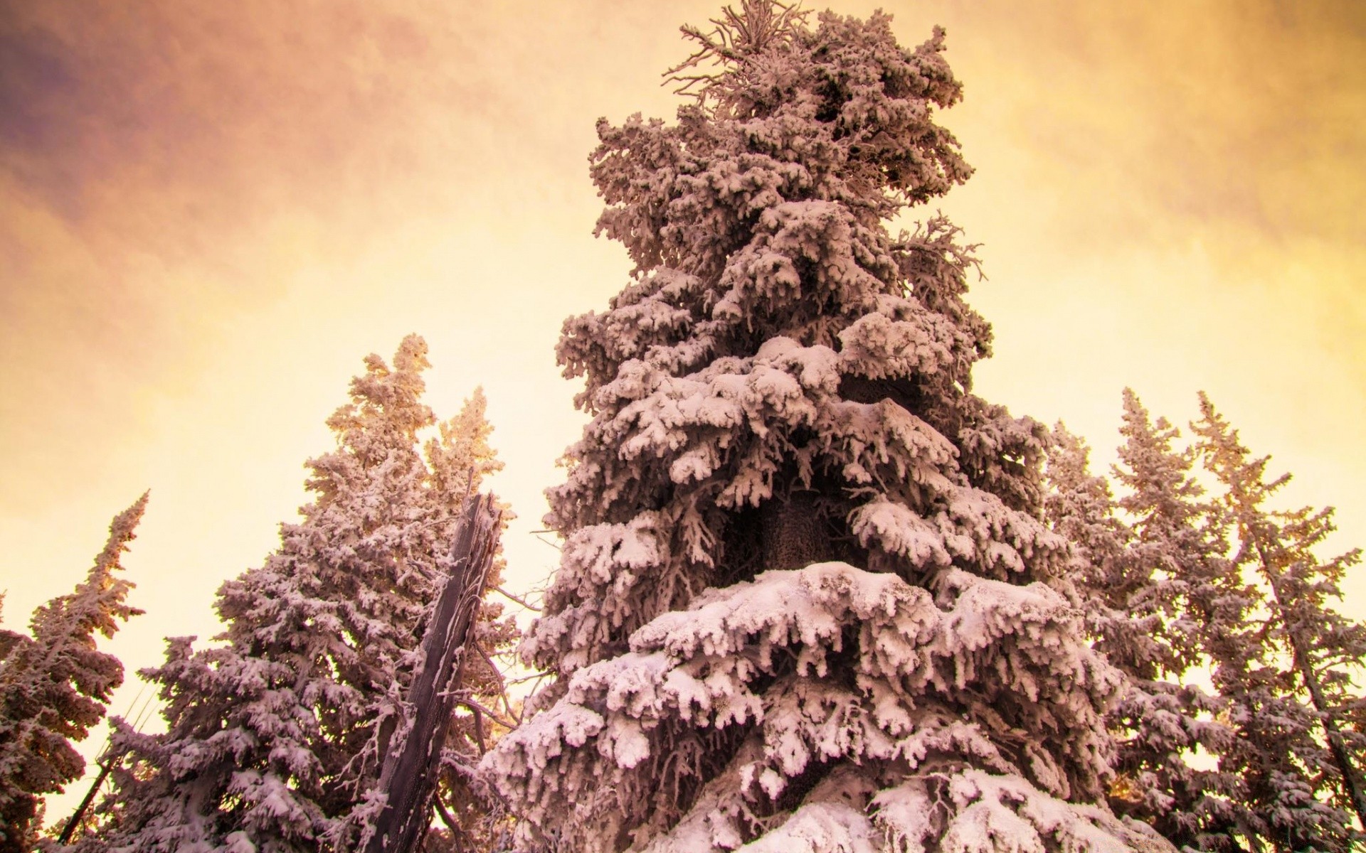 Árvores de Natal azedas estão cobertas de neve na encosta da montanha