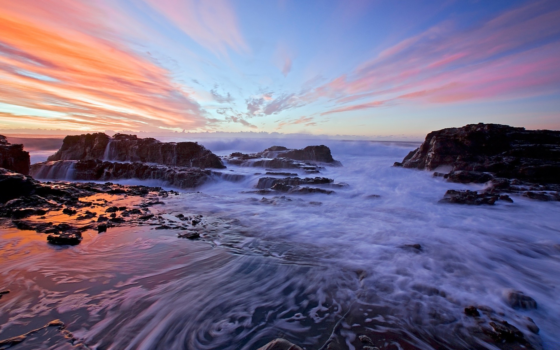 Crepúsculo entre as rochas e o mar