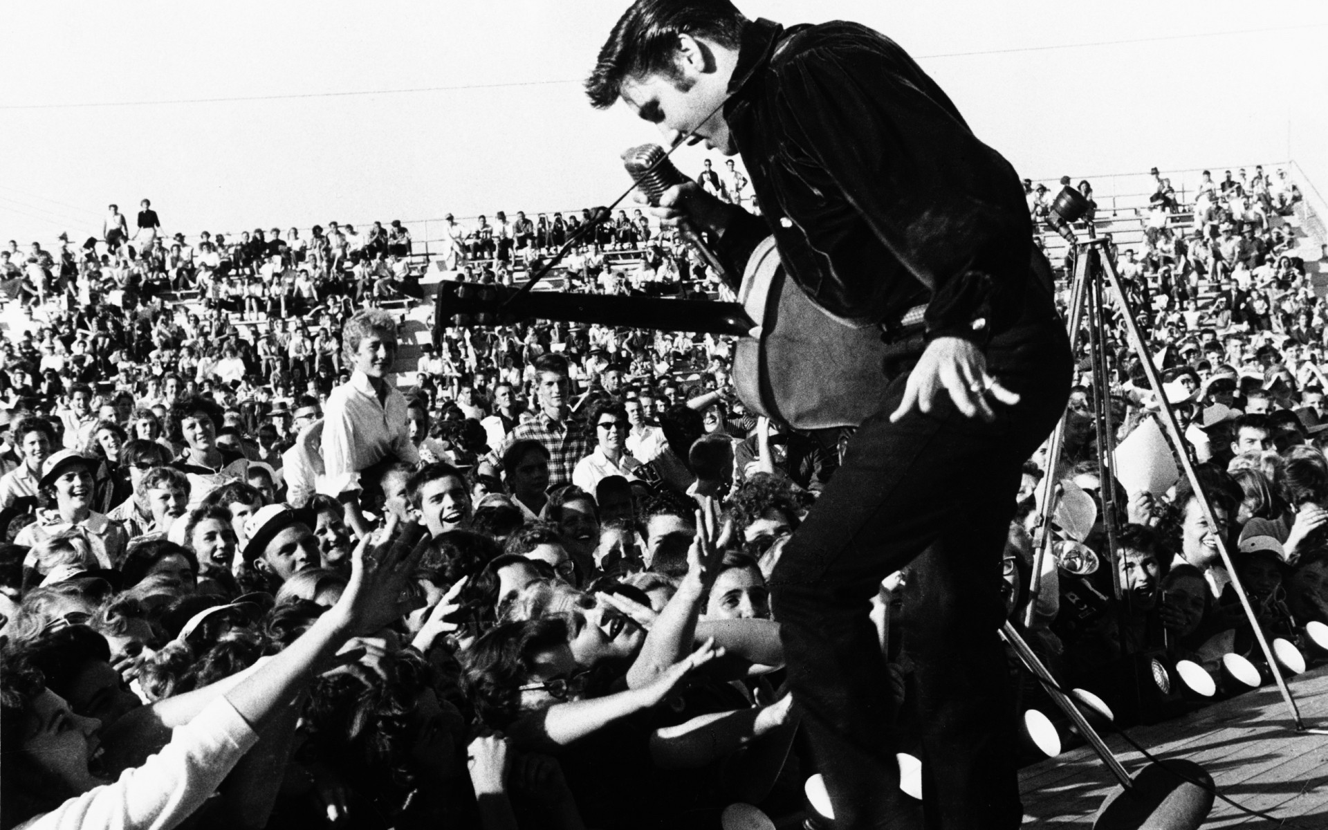Foto em preto e branco. Elvis no palco na frente da multidão