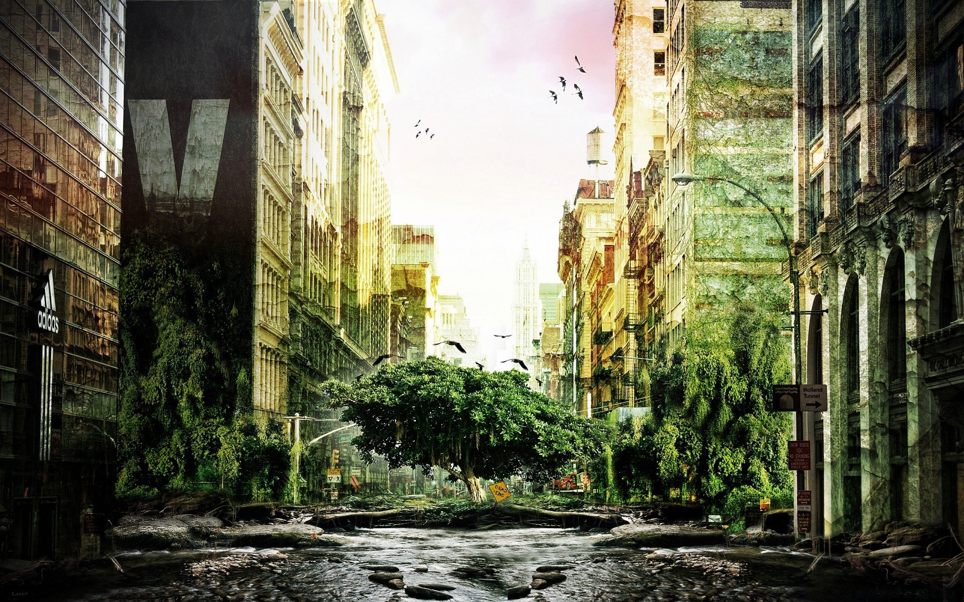 Árvore cresce no meio de uma estrada em uma cidade abandonada