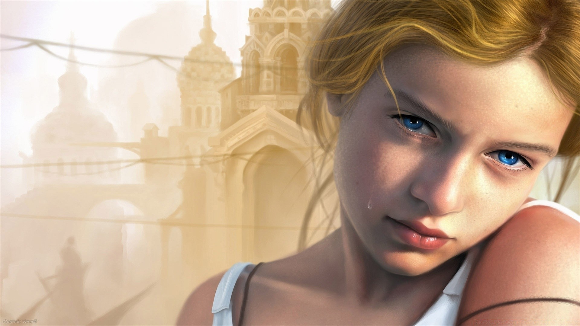 Menina com olhos azuis no fundo dos edifícios