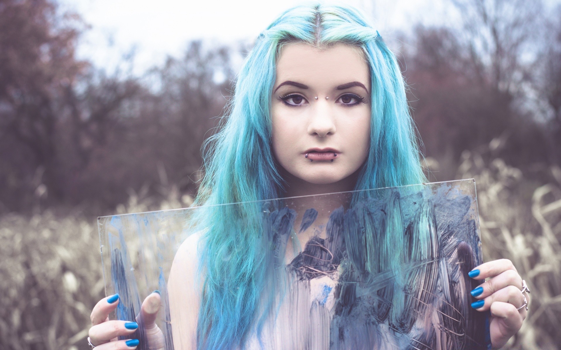 Menina bonita close-up com cabelo azul