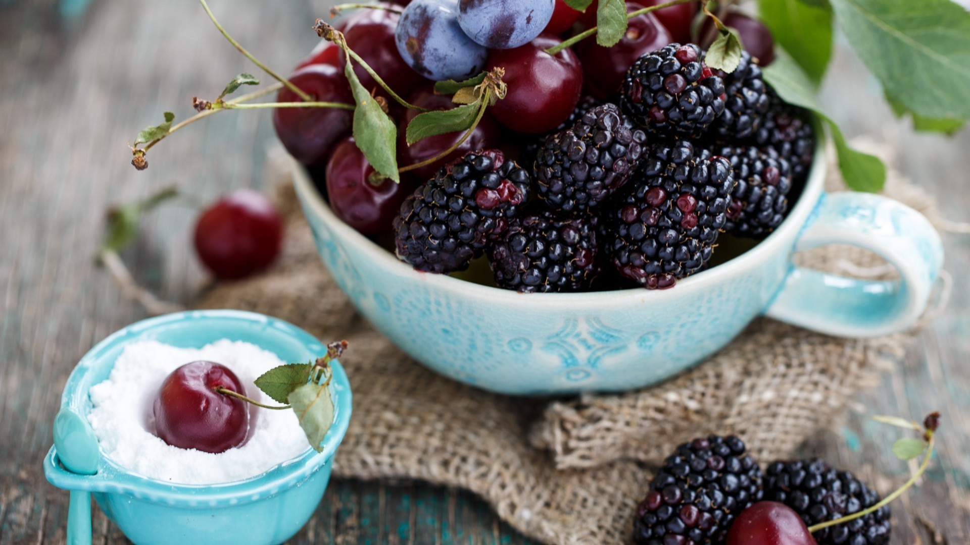 Amoreira em um copo azul. Bagas em pratos brilhantes