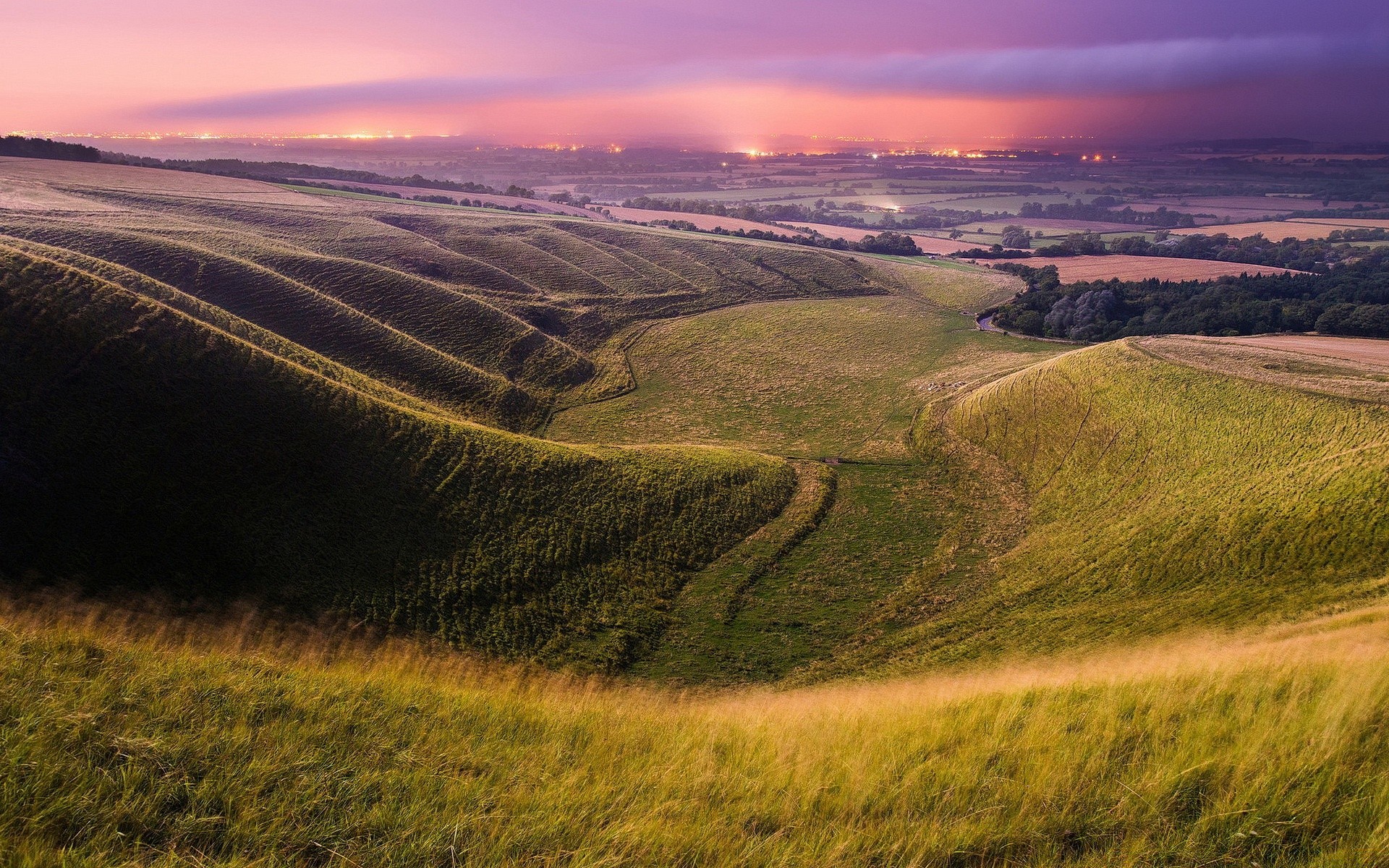 Pôr do sol paisagem em meio a campos verdes e montanhas