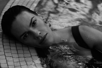Foto monocromática de uma menina na piscina