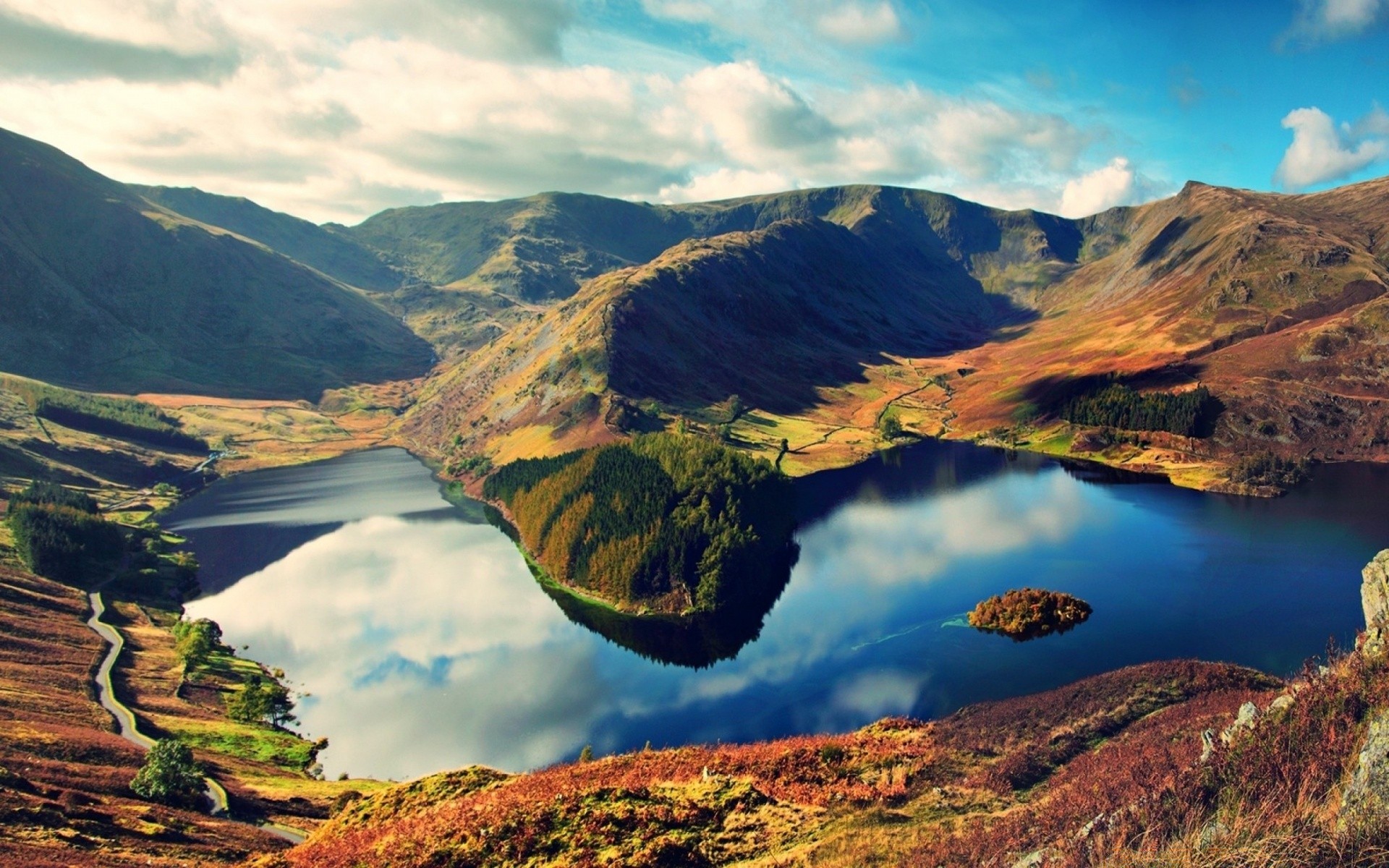 Paisagem de montanha maravilhosa com a cidade à beira do lago