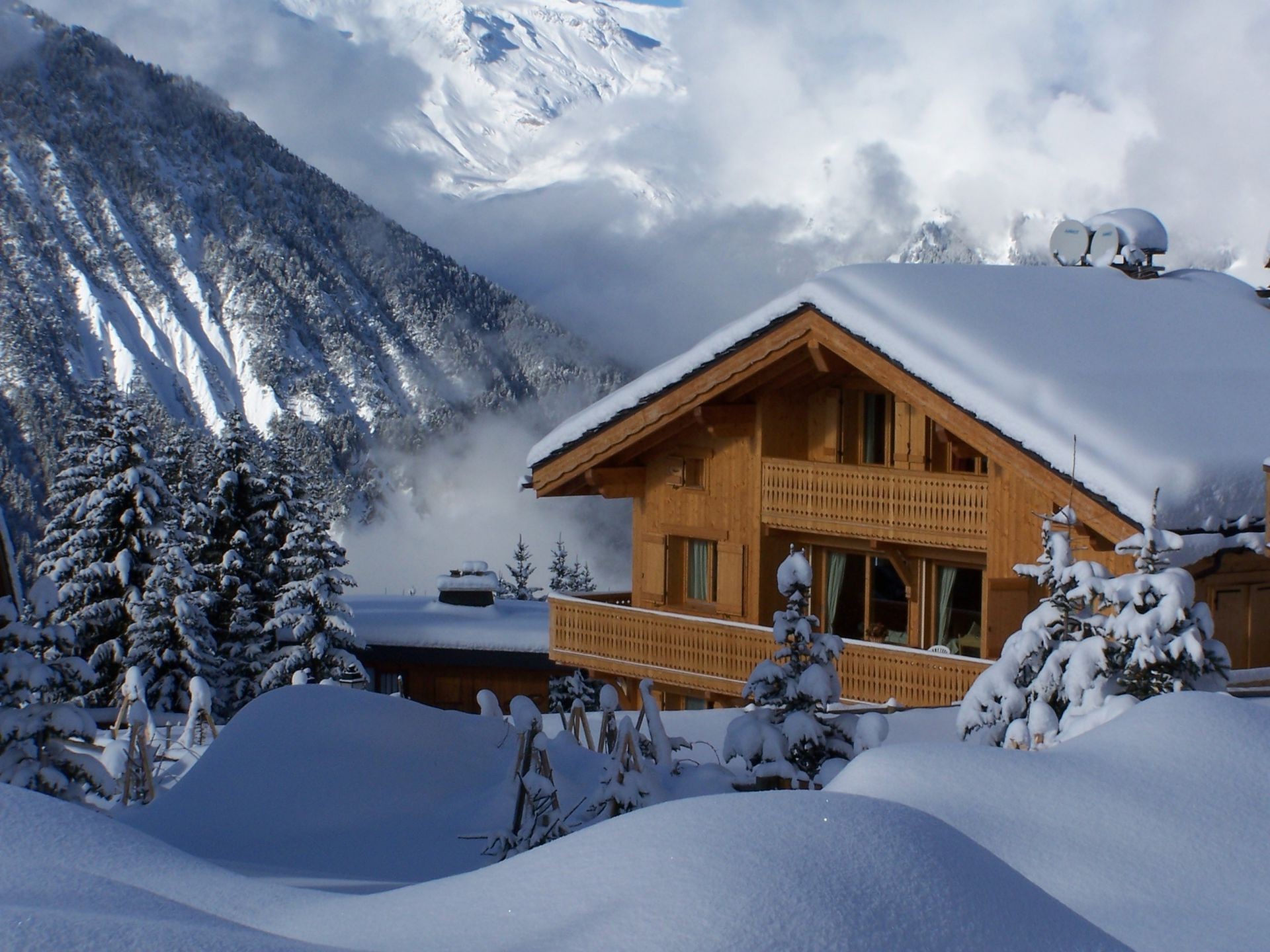 Avalanche saindo da montanha atrás da casa