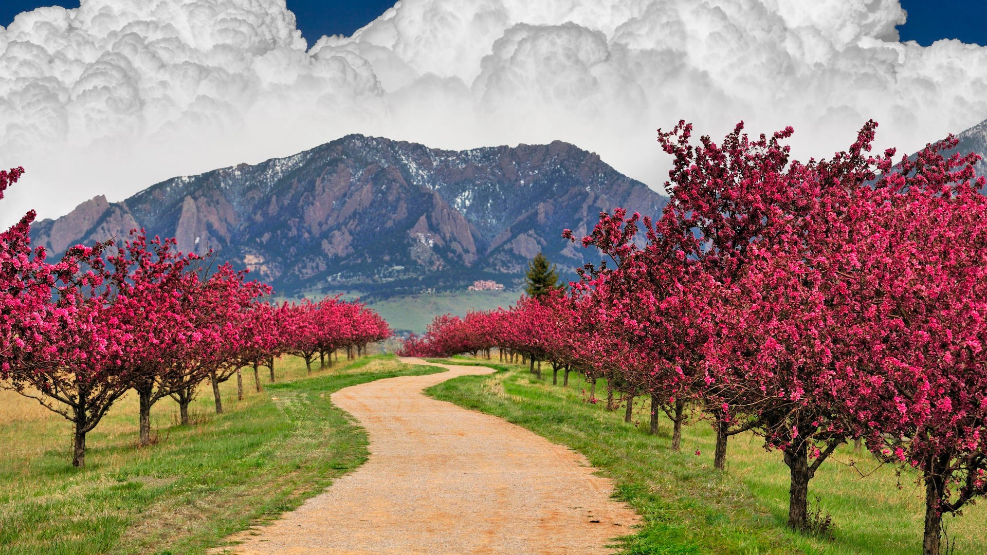 Uma montanha coberta de neve no céu azul cercada por uma floresta verde com um lago