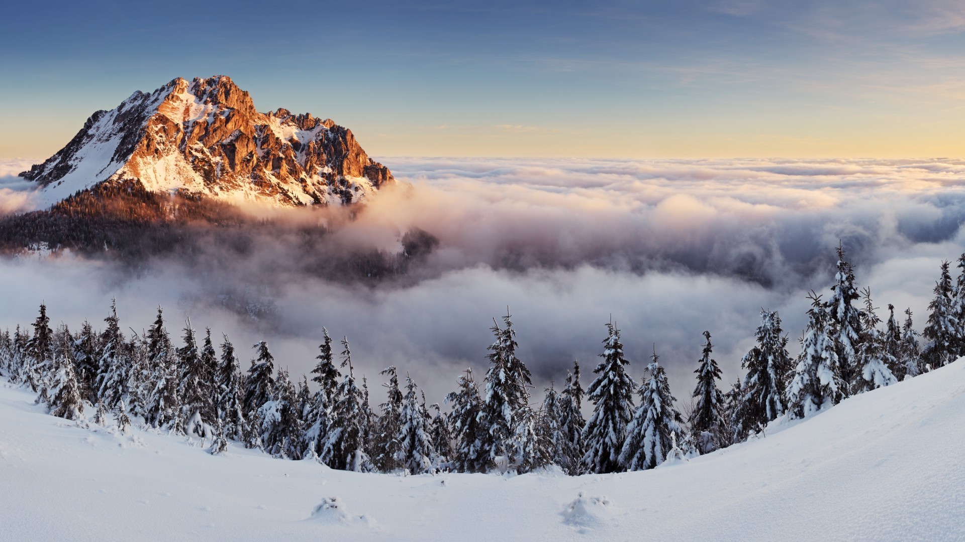 Fotopayazage com a imagem de um lago transparente entre as pedras contra o fundo de uma alta floresta de coníferas e montanhasFotopayazage com a imagem de um lago transparente entre as pedras contra o fundo de uma Alta Floresta de coníferas e montanhas
