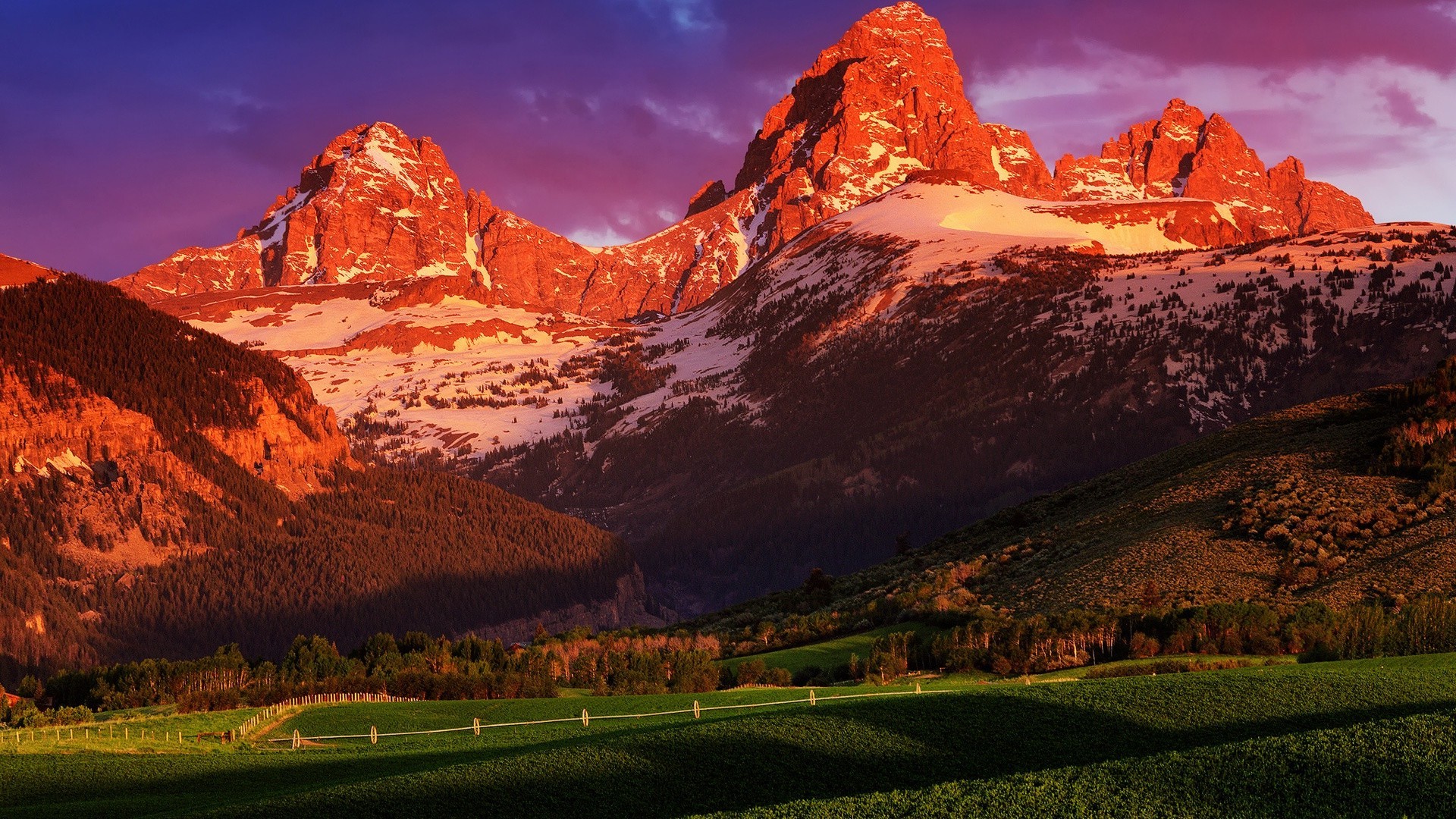 Montanhas cobertas de neve com prado verde ao pôr do sol