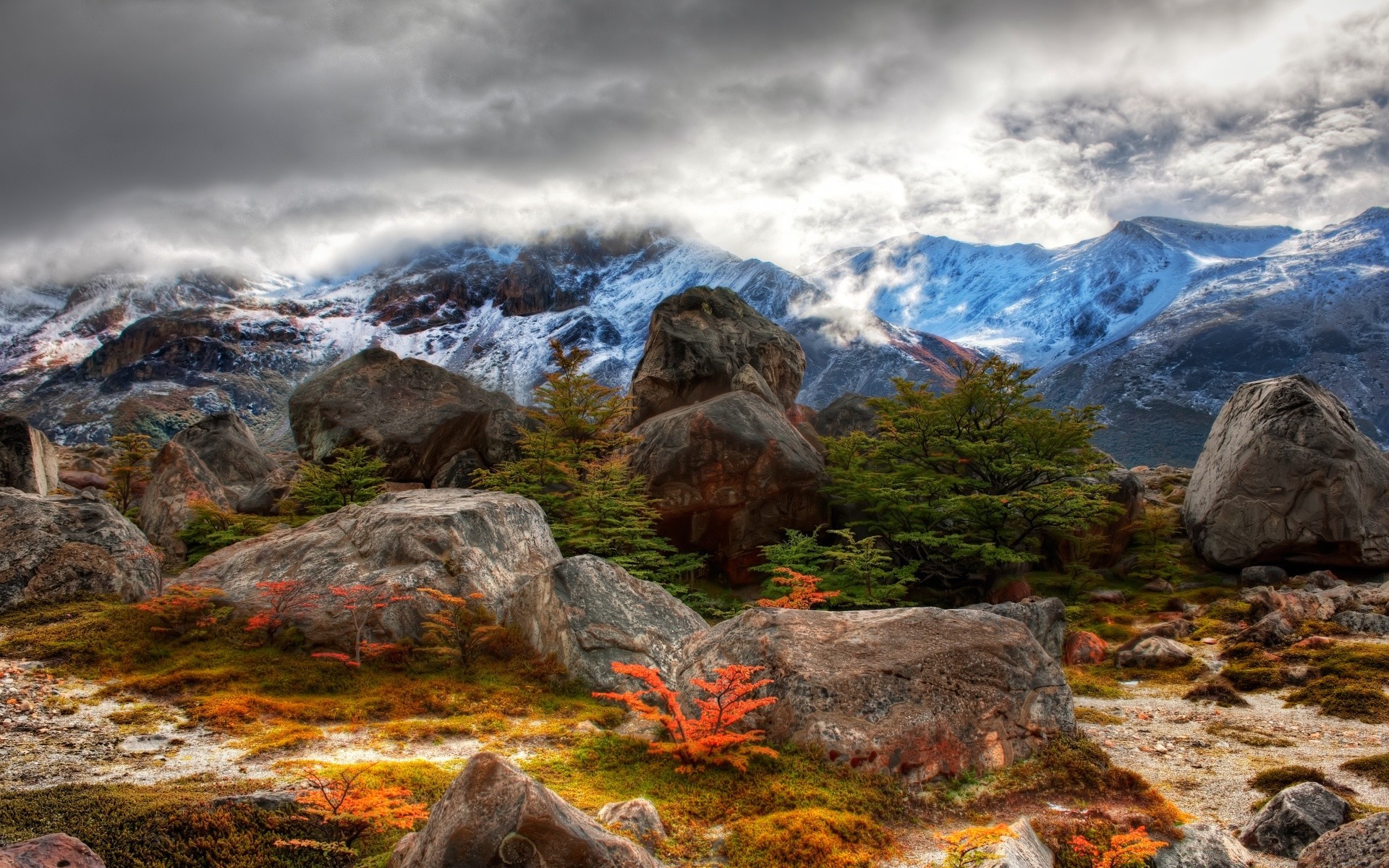 Montanhas que caem no céu nublado