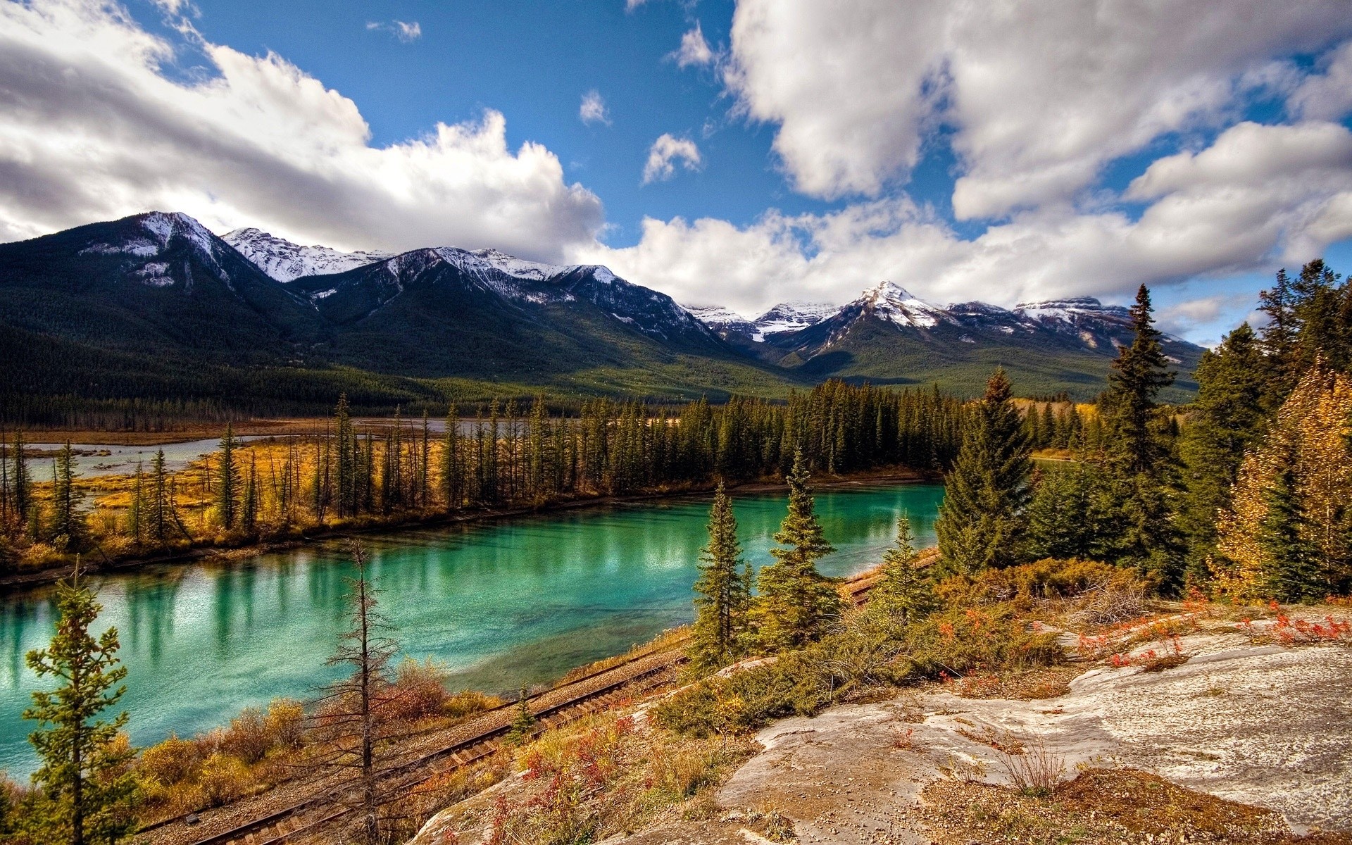 Paisagem. Lago nas montanhas, nuvens no céu e picos nevados