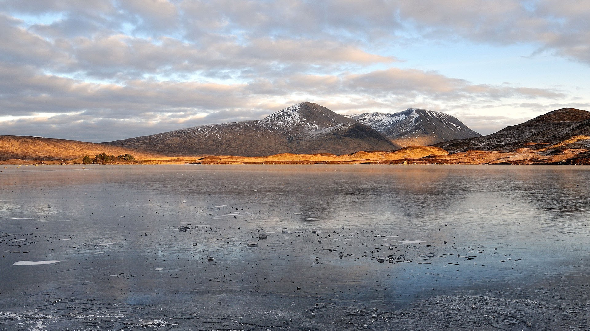 Belas montanhas e céu com nuvens são refletidas no lago