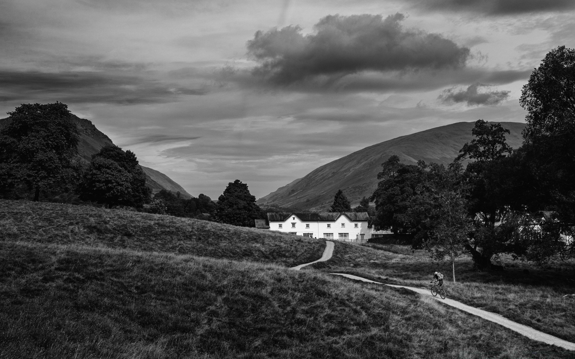 Paisagem em preto e branco do céu e das montanhas estrada para viajar
