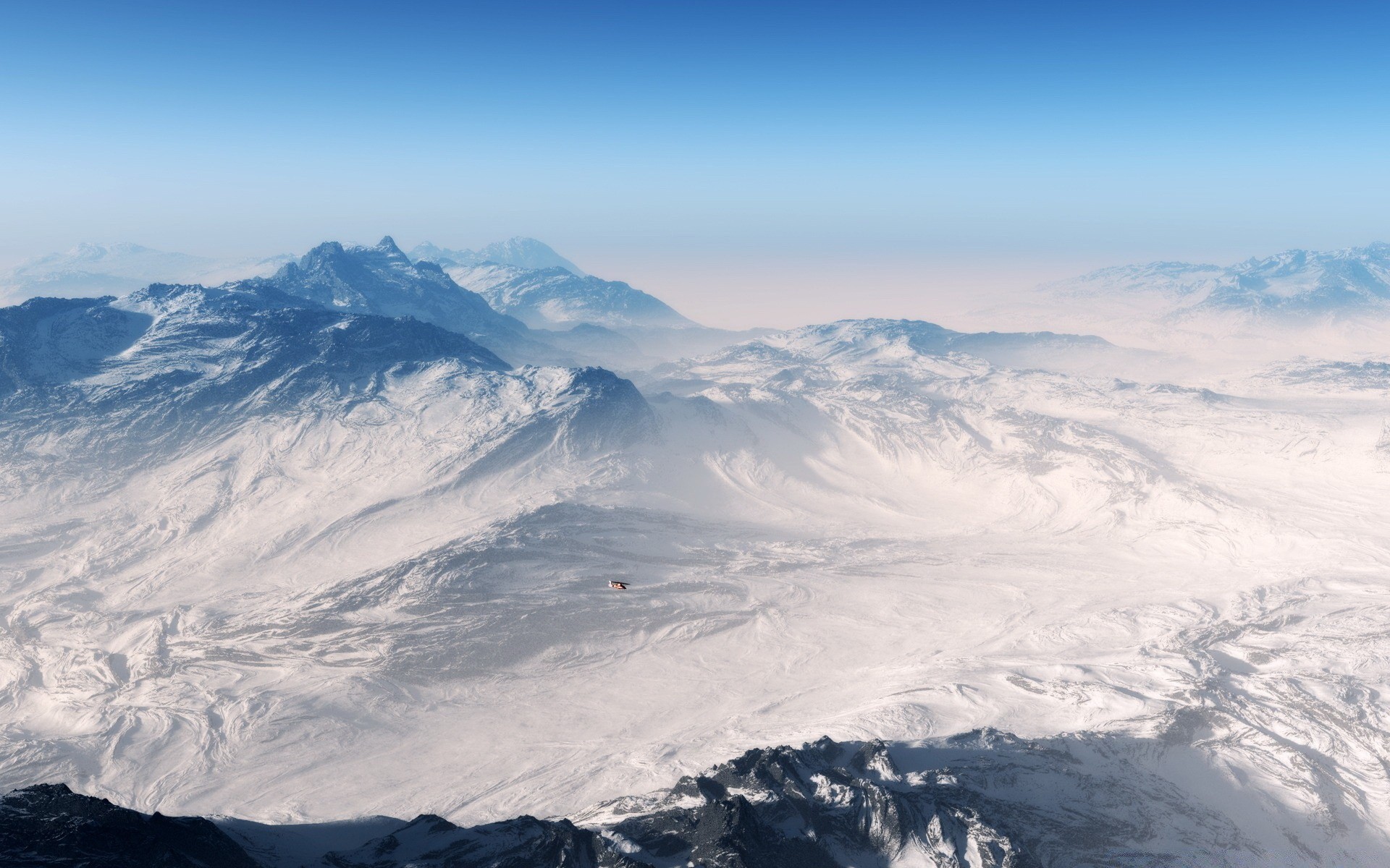 Sob a asa do avião, as montanhas ficam brancas( aparentemente, os Alpes), porque ele dirigiu o caminho para a Europa