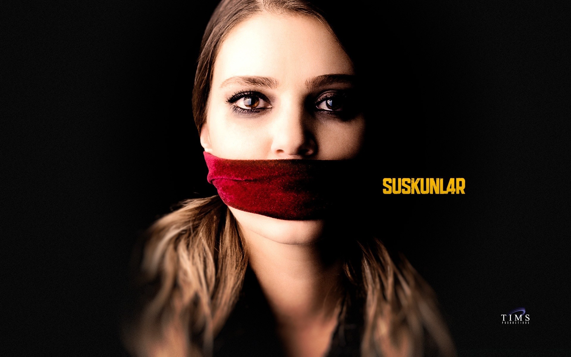 Mulher com a boca fechada em um fundo escuro