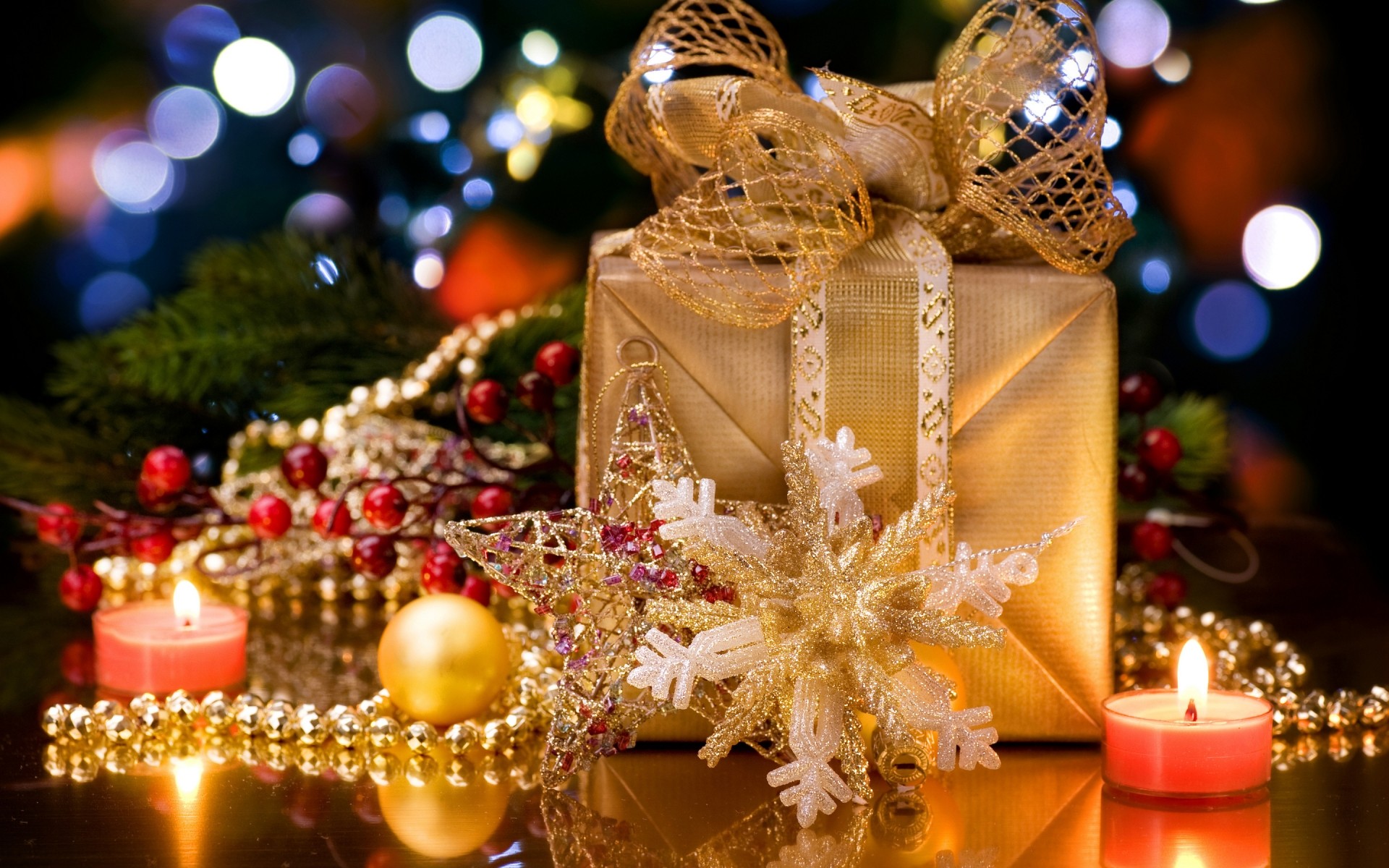 Presente de embalagem de ouro com um grande arco em pé sobre a mesa com velas acesas